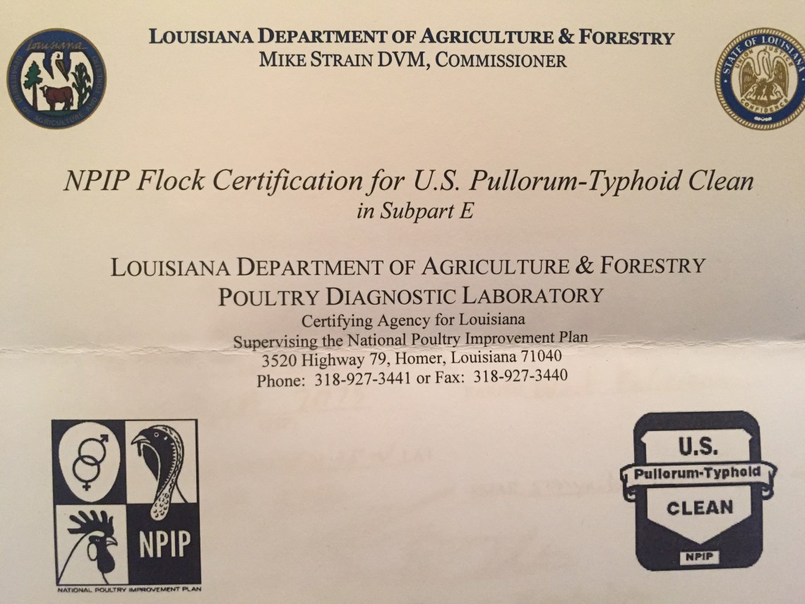 If you have chickens, or if you plan to purchase poultry of any type, it’s a good idea to be sure the flock is NPIP certified. This is a free or low-cost plan run by each state agriculture agency. A state certified veterinarian or veterinary technician will come to your home once a year and test a percentage of birds for Salmonella pullourm and Salmonella Typhoid. These diseases can cause 80% of baby poultry to die if infected.