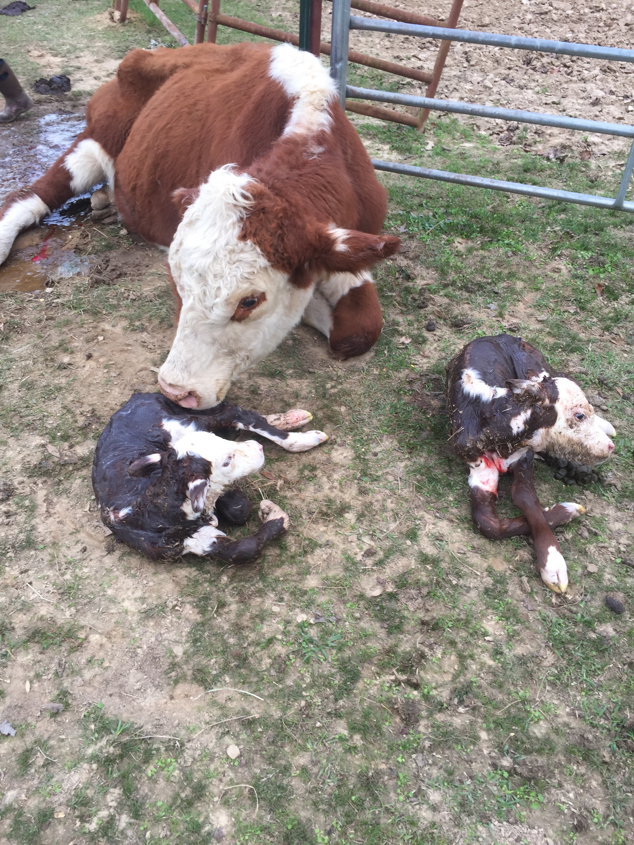 When I checked again, she had a 2nd calf in the birth canal. We helped her deliver the 2nd calf, also a heifer.