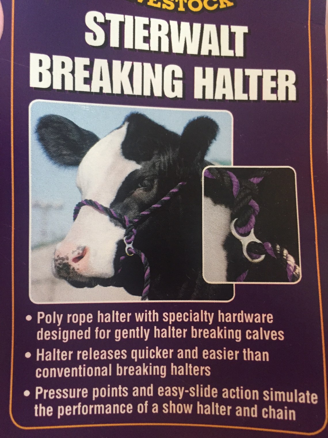 I found this neat halter at a show trailer yesterday. Rope halters are the standard for teaching a calf to lead and tie. The one downside to a traditional halter is that once the chin tightens, it stays tight even when the calf gives to pressure.