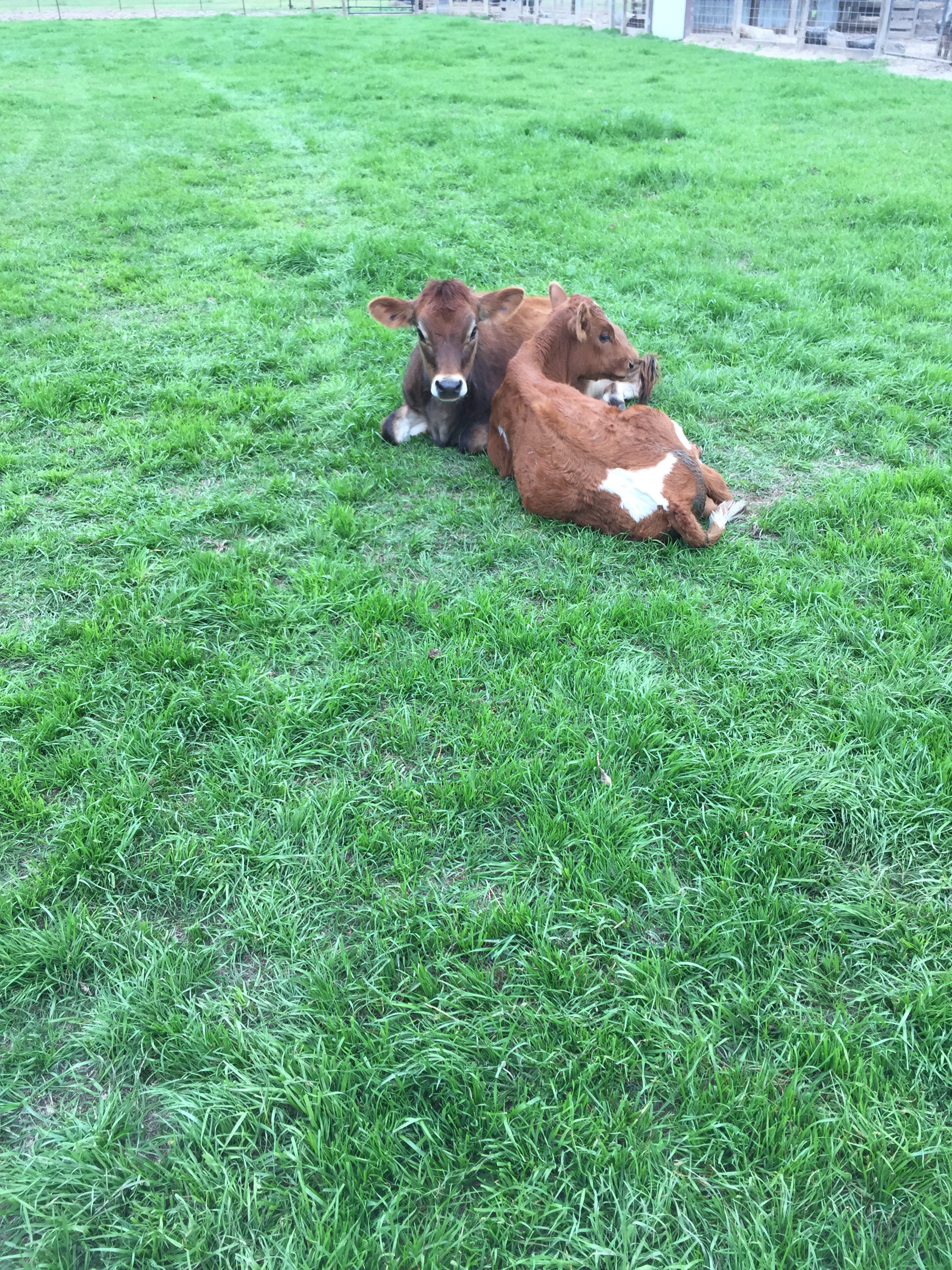 This is Freckles, the Ayrshire steer calf, with the white patch. Tiki, the Jersey Heifer, will get to continue nursing (show calf privileges).