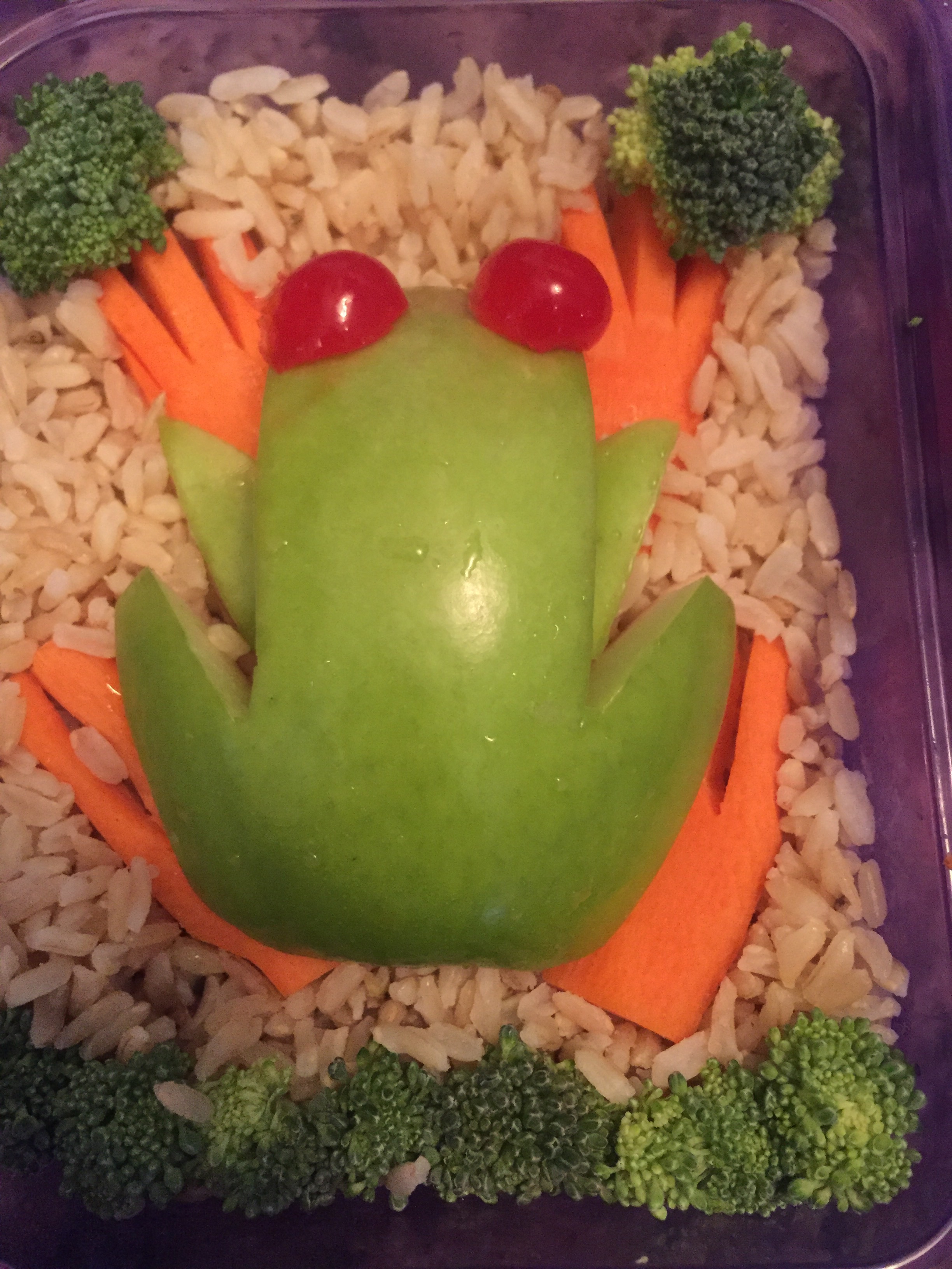 She found this cute frog that she wanted to make out of an apple. She wanted to put it on a bed of brown rice and broccoli for a “natural environment”.