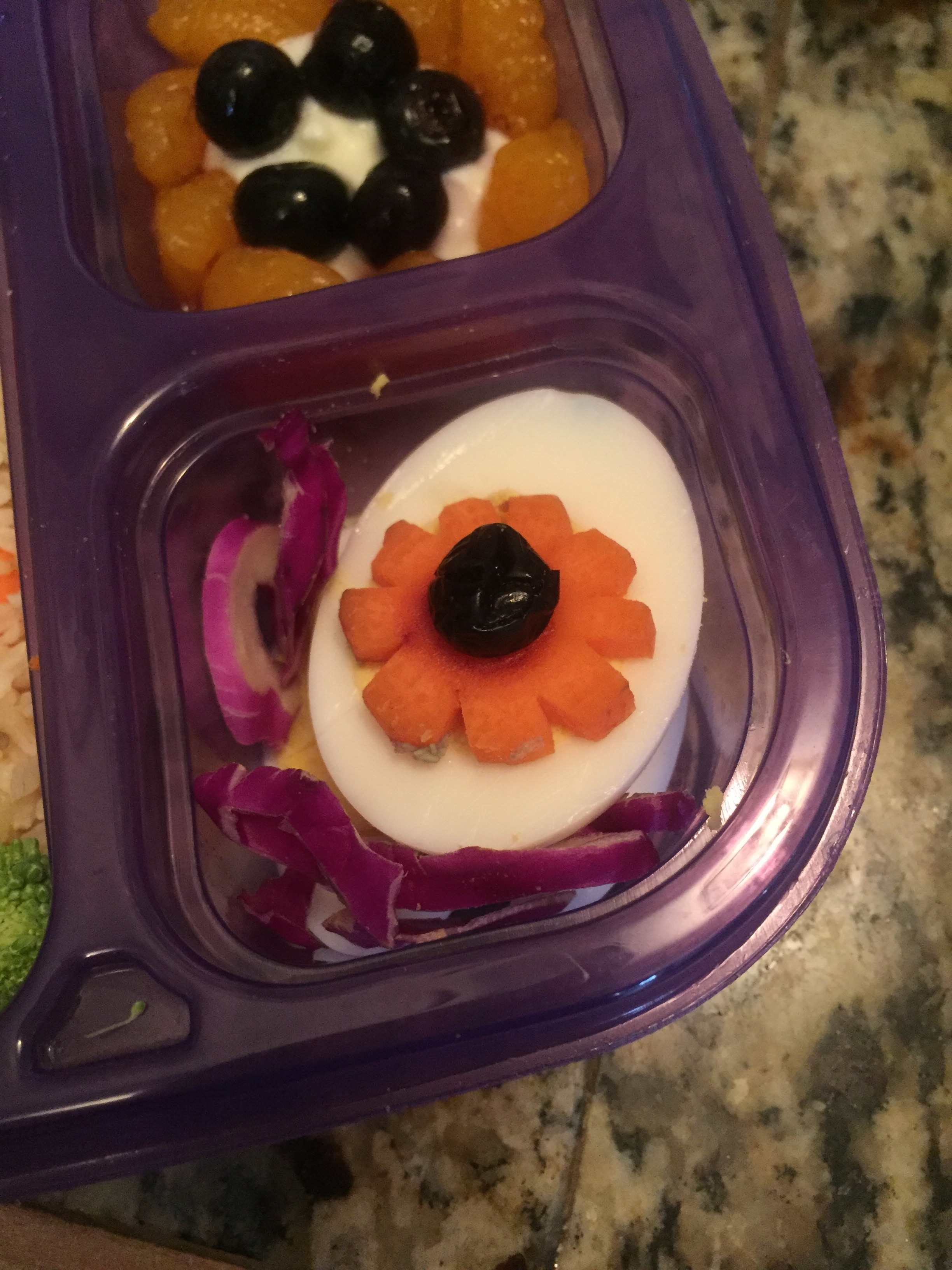 Half of her box is fruit & veggies. Her lean protein is a boiled egg, decorated with a carrot slice flower and a blueberry (which will stain the egg).