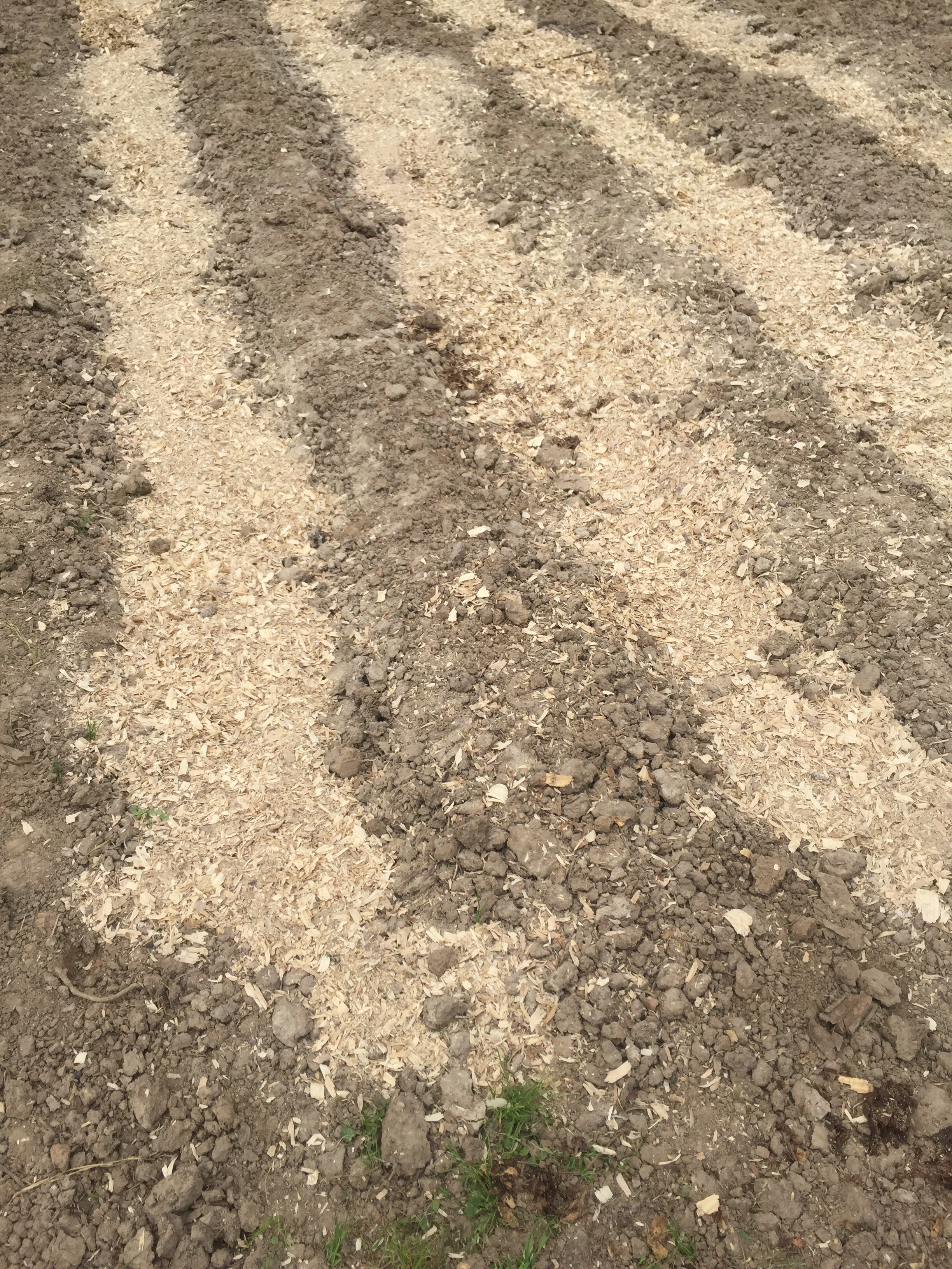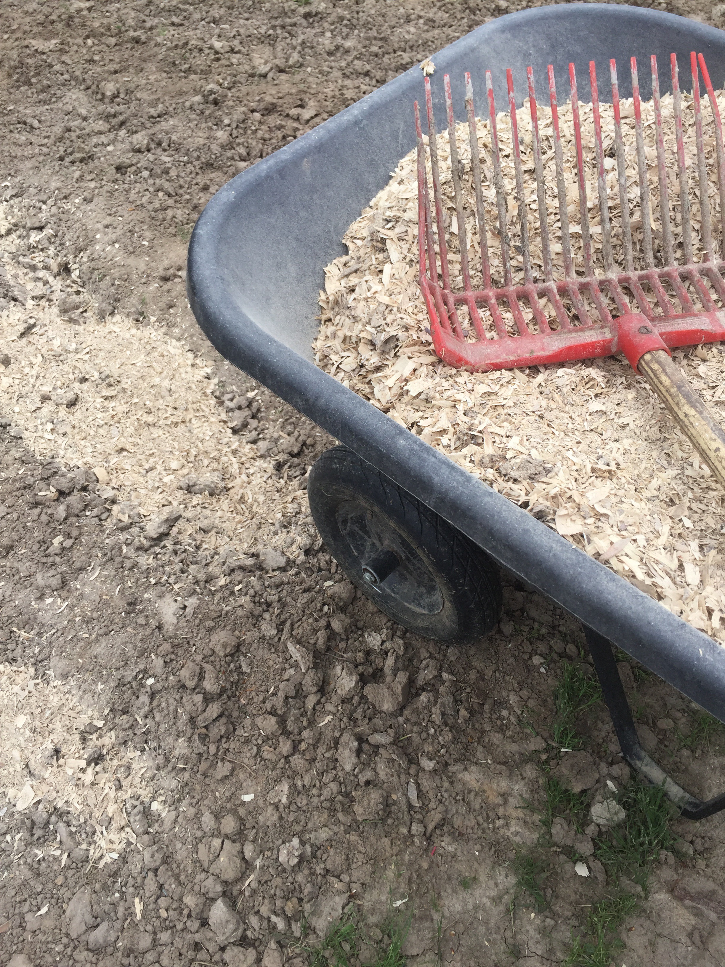 Our first potato plant has peeked up through the soil. Today I’m mulching my garden with shavings from the pig barn.