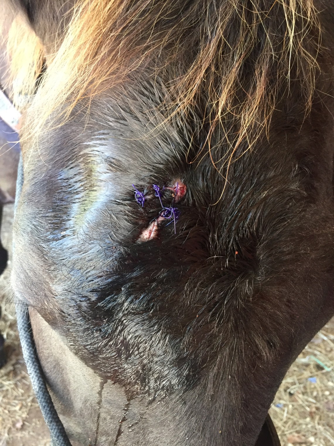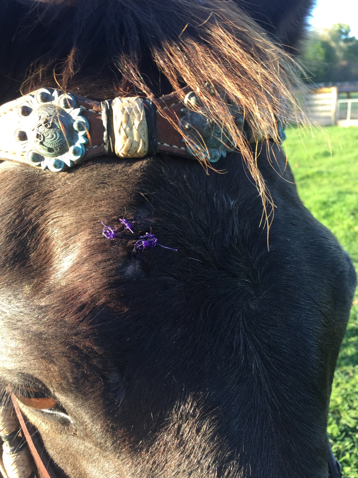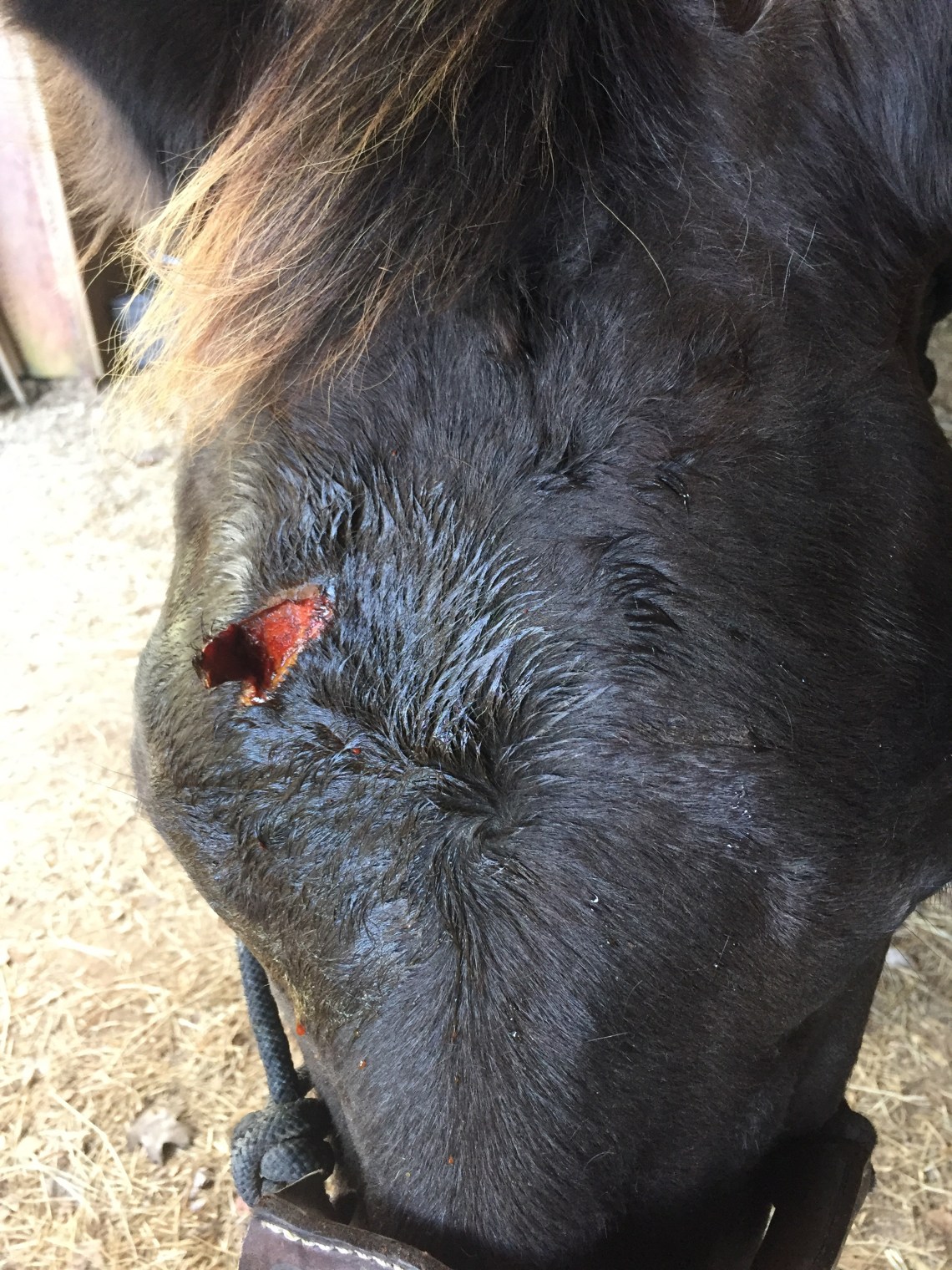 Owen went to get his mare, Cotton, to rope calves. When he brought her out of the stall, he came and told me she had a cut on her head. This is what it looked like:
