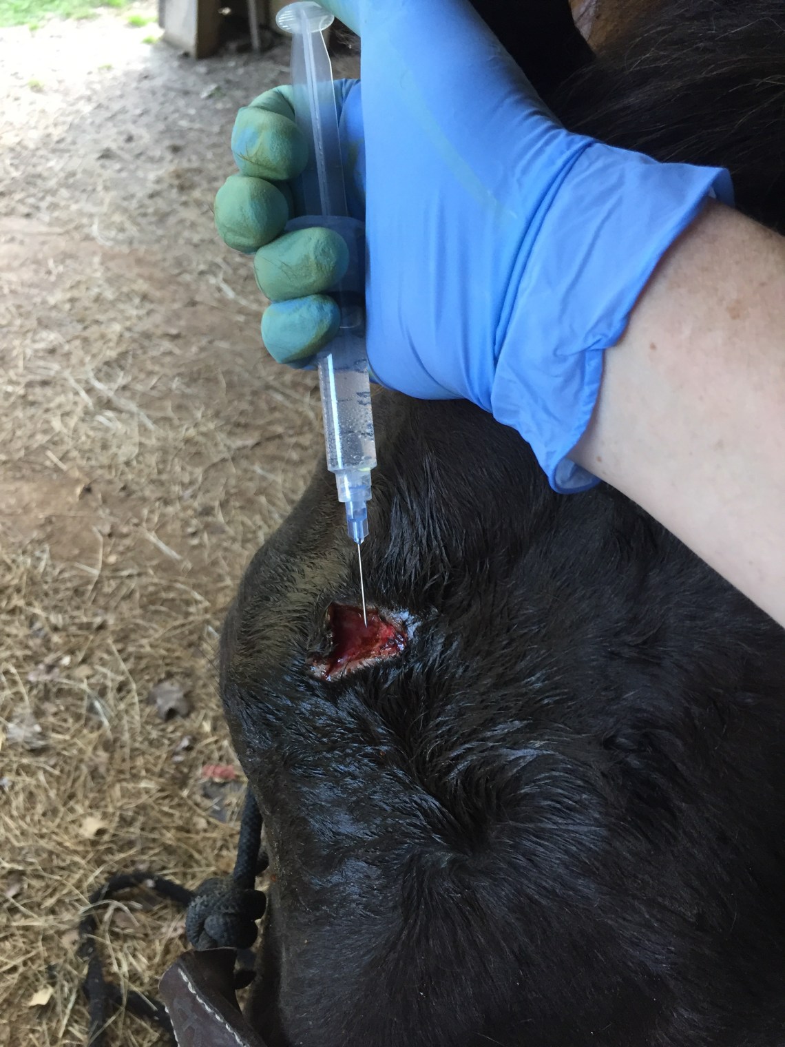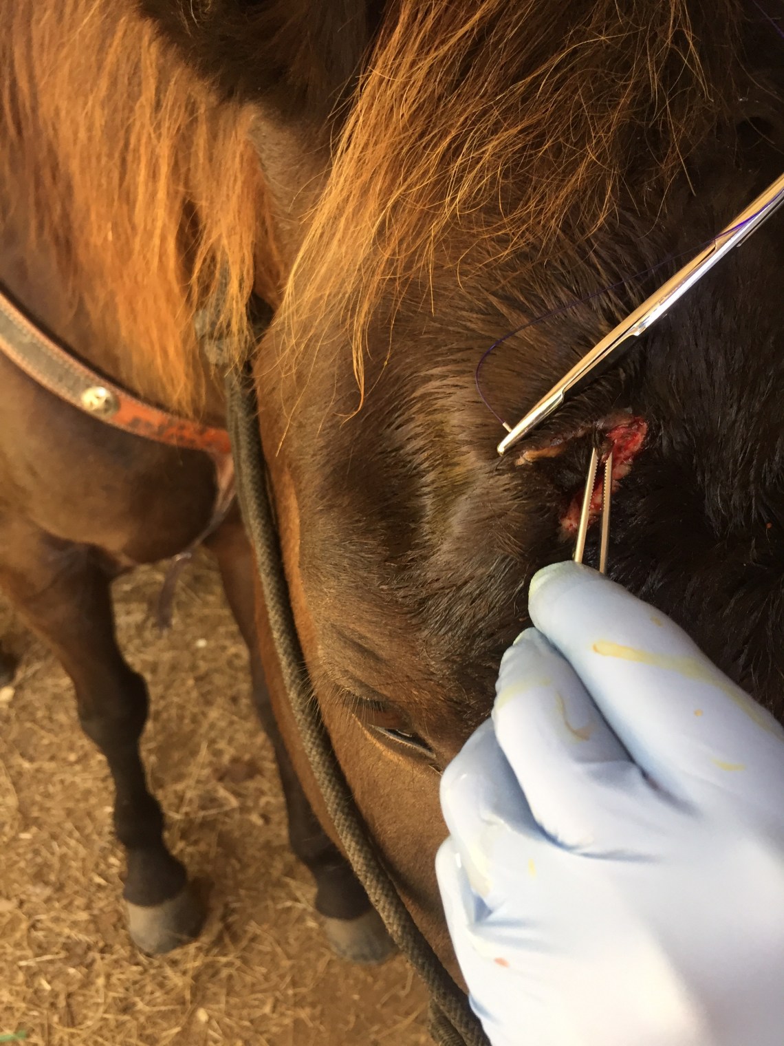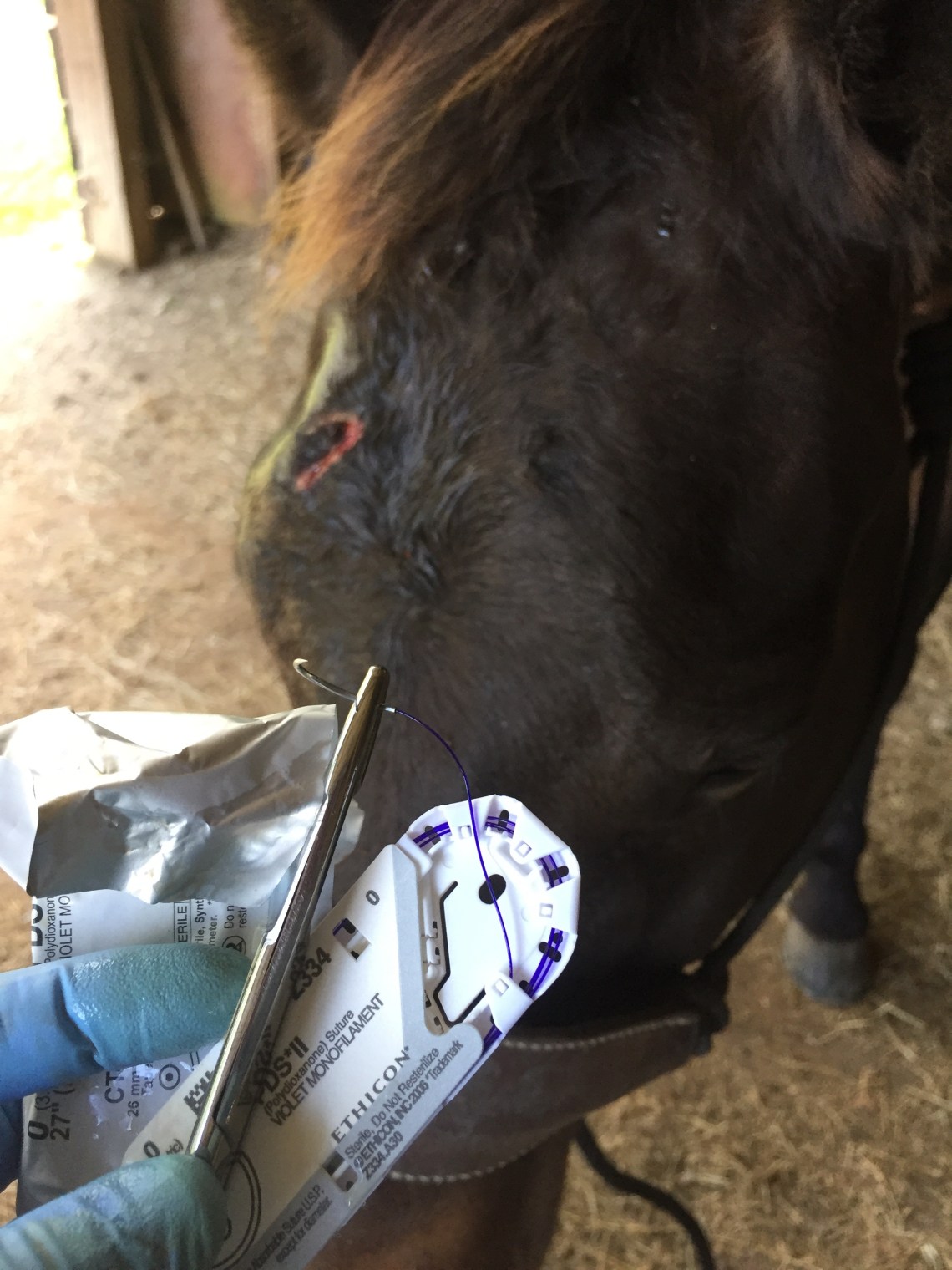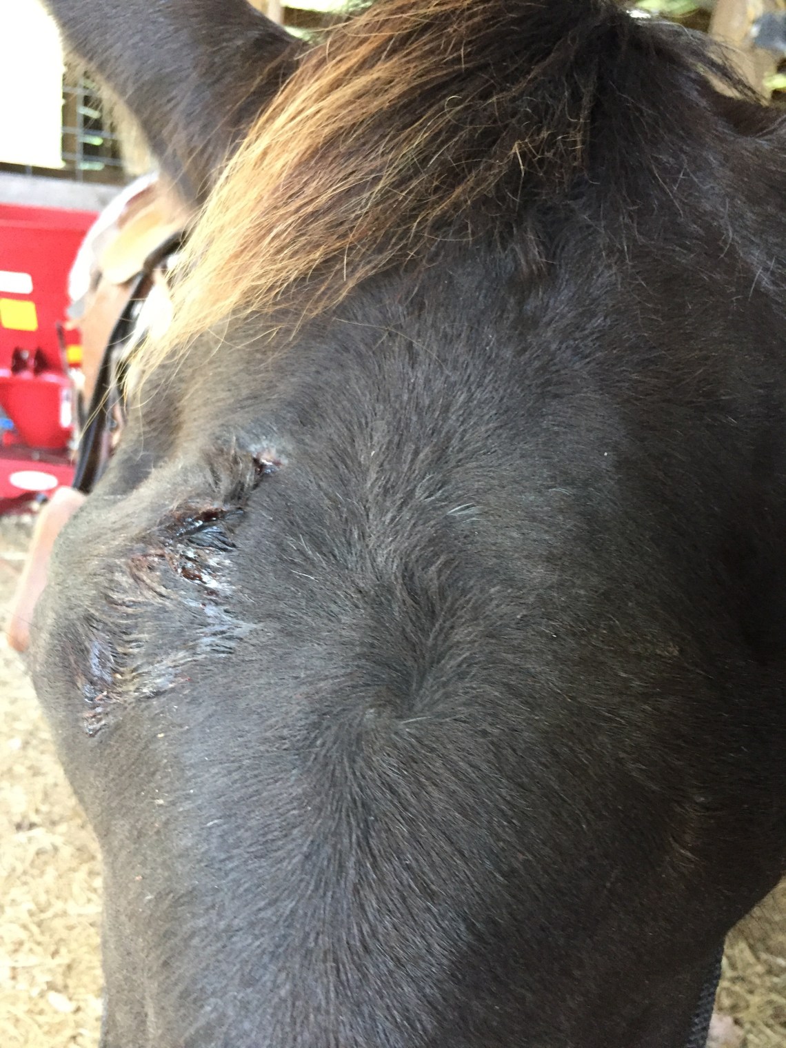 Owen went to get his mare, Cotton, to rope calves. When he brought her out of the stall, he came and told me she had a cut on her head. This is what it looked like: