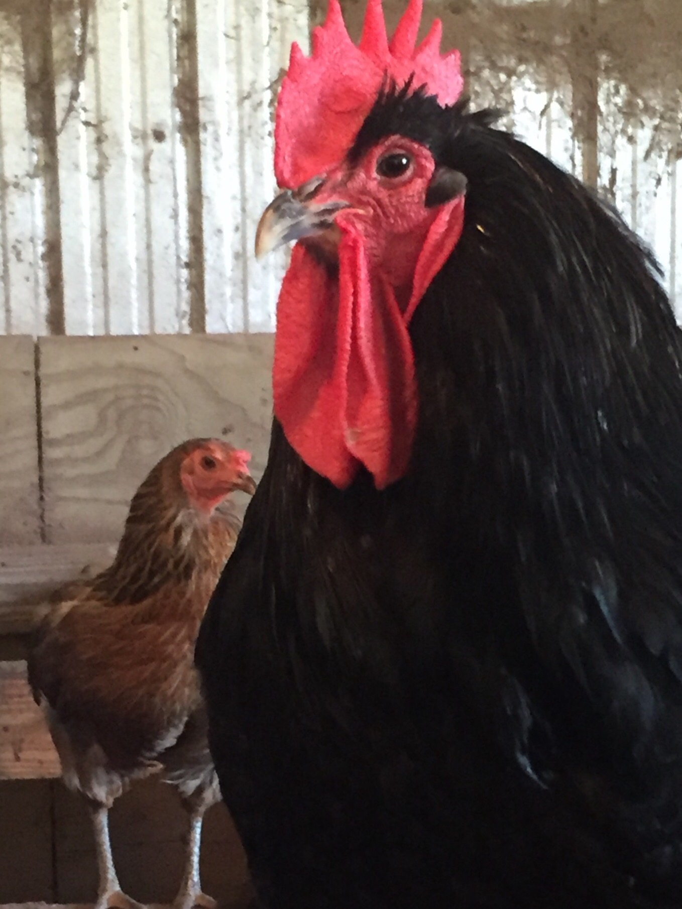 This little Ameracauna hen behind the rooster has a pea comb and very small wattles.