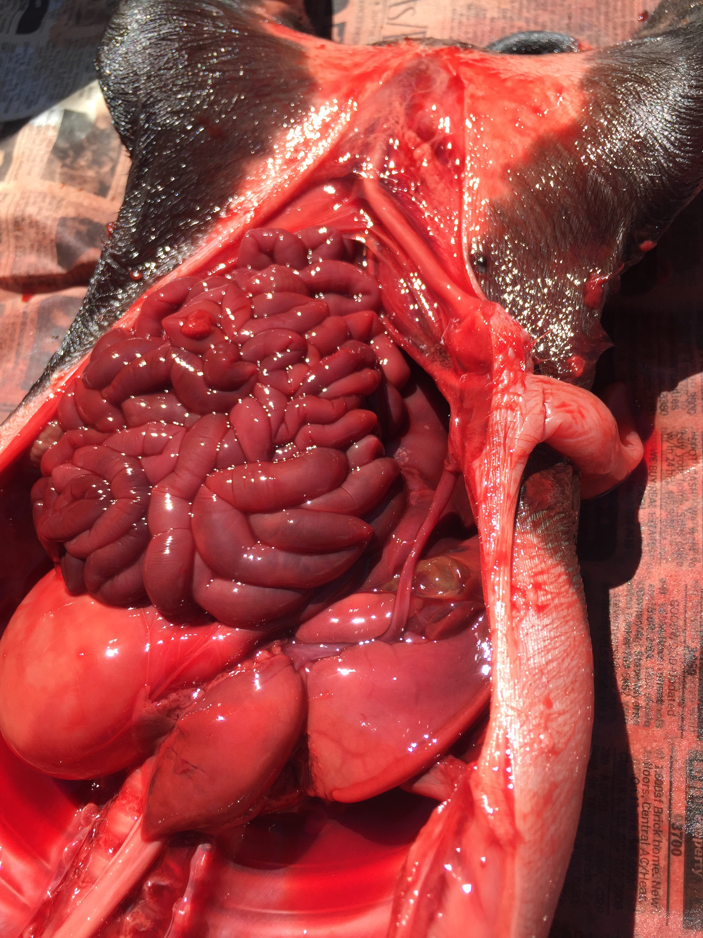 Then we make a ventral midline incision through the skin, then the muscle layer. The diaphragm is the muscle that separates the thorax (heart & lungs) from the abdomen (digestive and urinary organs). I will show you some organs with this picture (yes – it’s bloody).