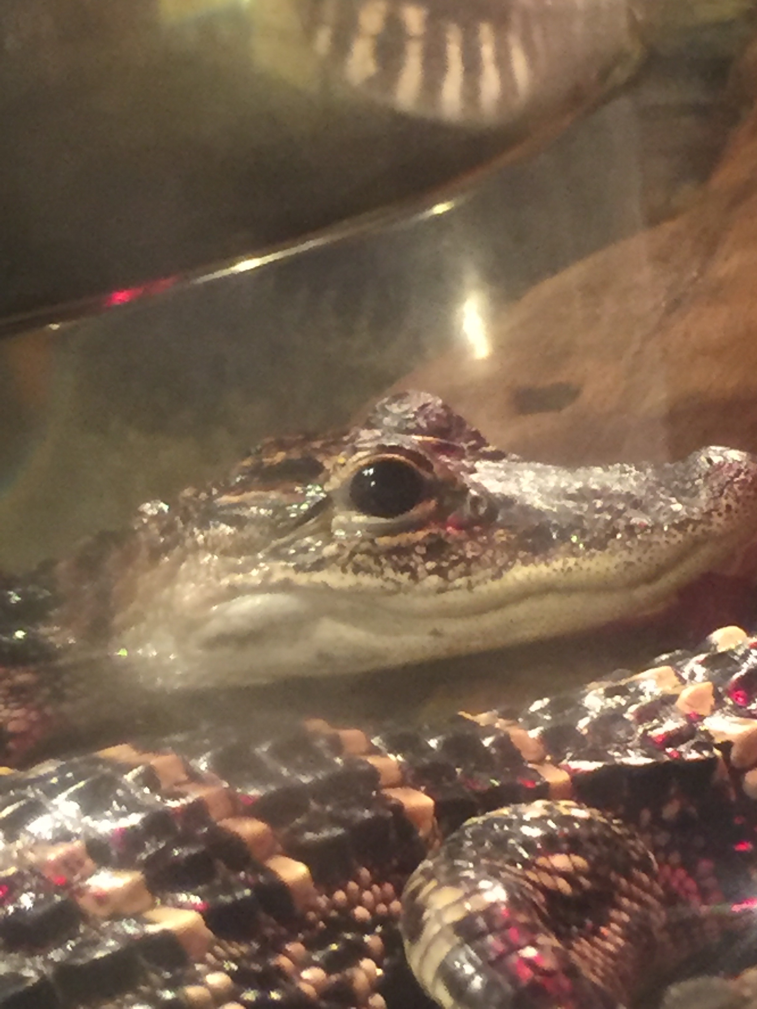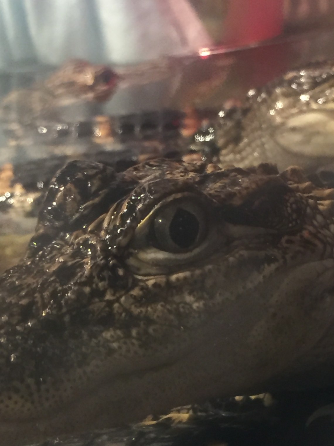 This is another abnormality I noticed in a tank of growing alligators. If you will notice the difference between the eye above and the eye below, you will see the iris is missing. My zoo veterinary friend says alligators do well without a proper lens, so this little guy should not have a problem.