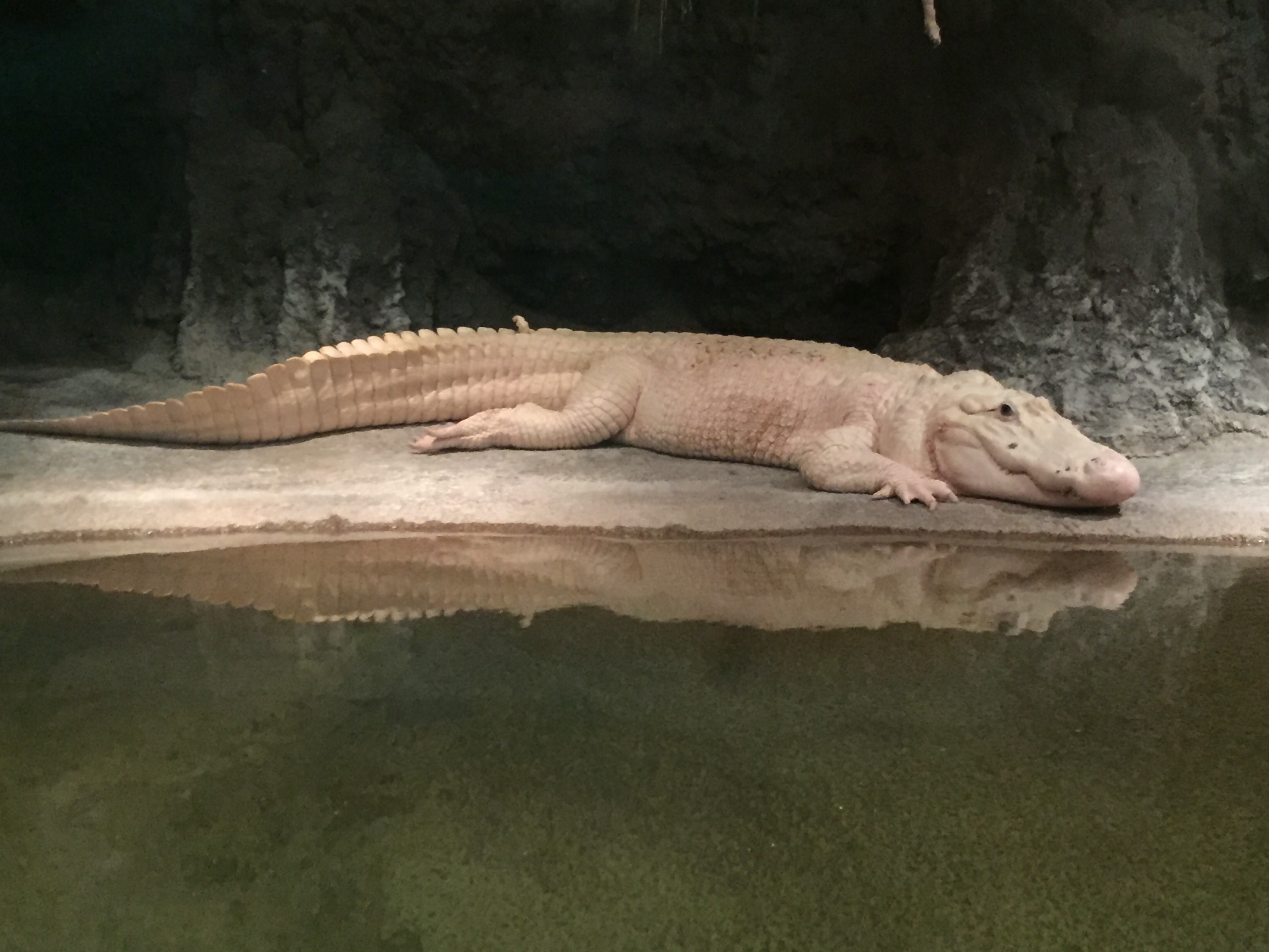 Albinos are rare in the wild because the normal camouflage color of the animal is lacking. This alligator lives a safe, protected life at the zoo.