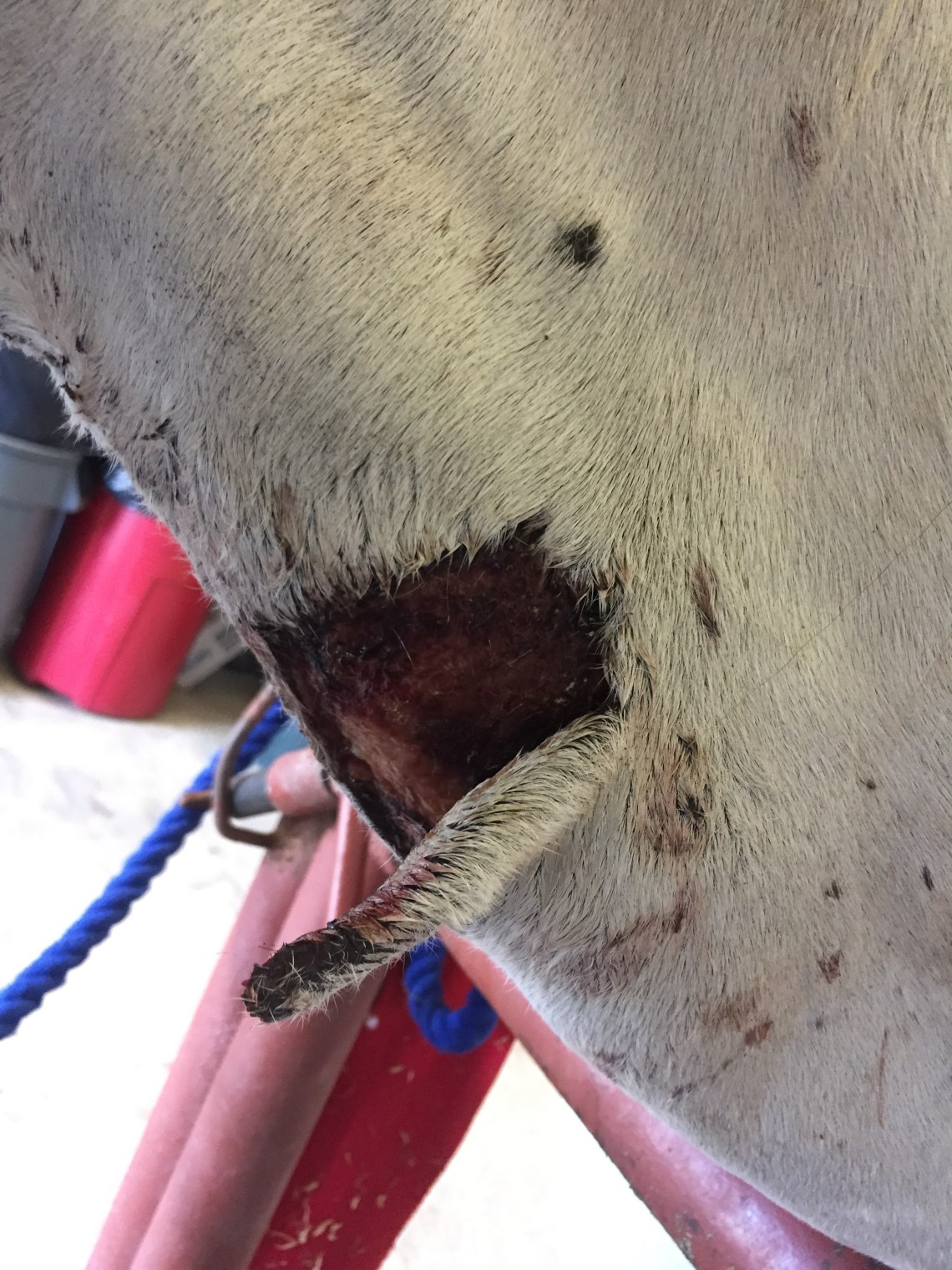 The horse injury above was a few days old, but I was able to freshen it up and sew that flap of skin back to the neck. It didn’t heal perfectly, but that skin acted as a bandage and regrew eventually to prevent a gaping hole in the neck.