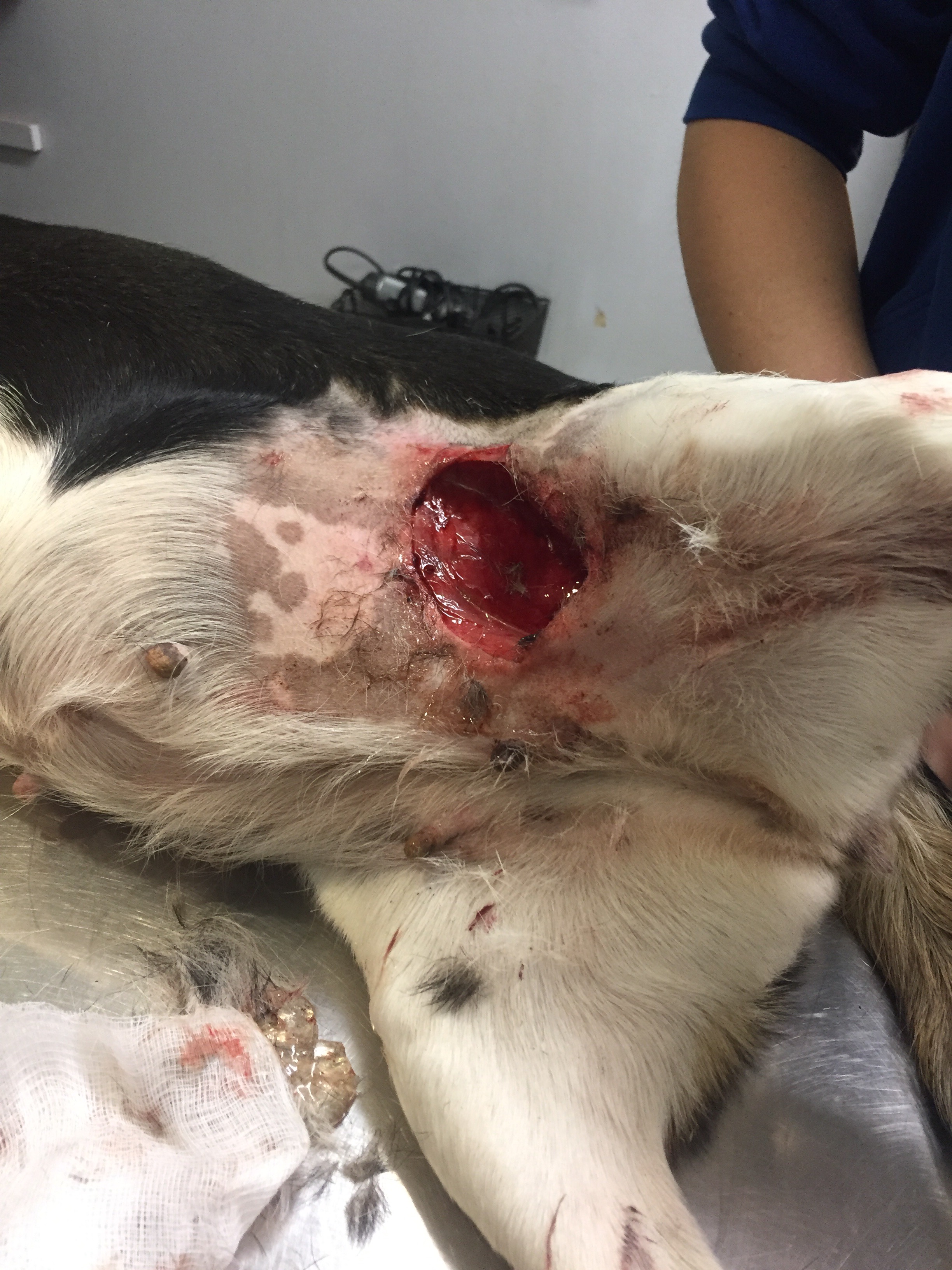 This beagle was found by her owners and brought in to the clinic immediately. It’s a perfect candidate for sutures because it’s fresh and clean.