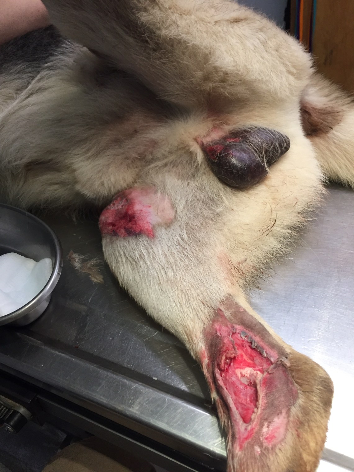3. When there is bone showing, it’s a definite emergency. This dog was run over by a car backing out of the driveway. That back hock lost skin, ligaments, and joint capsule. There were bone fragments that had to be removed.