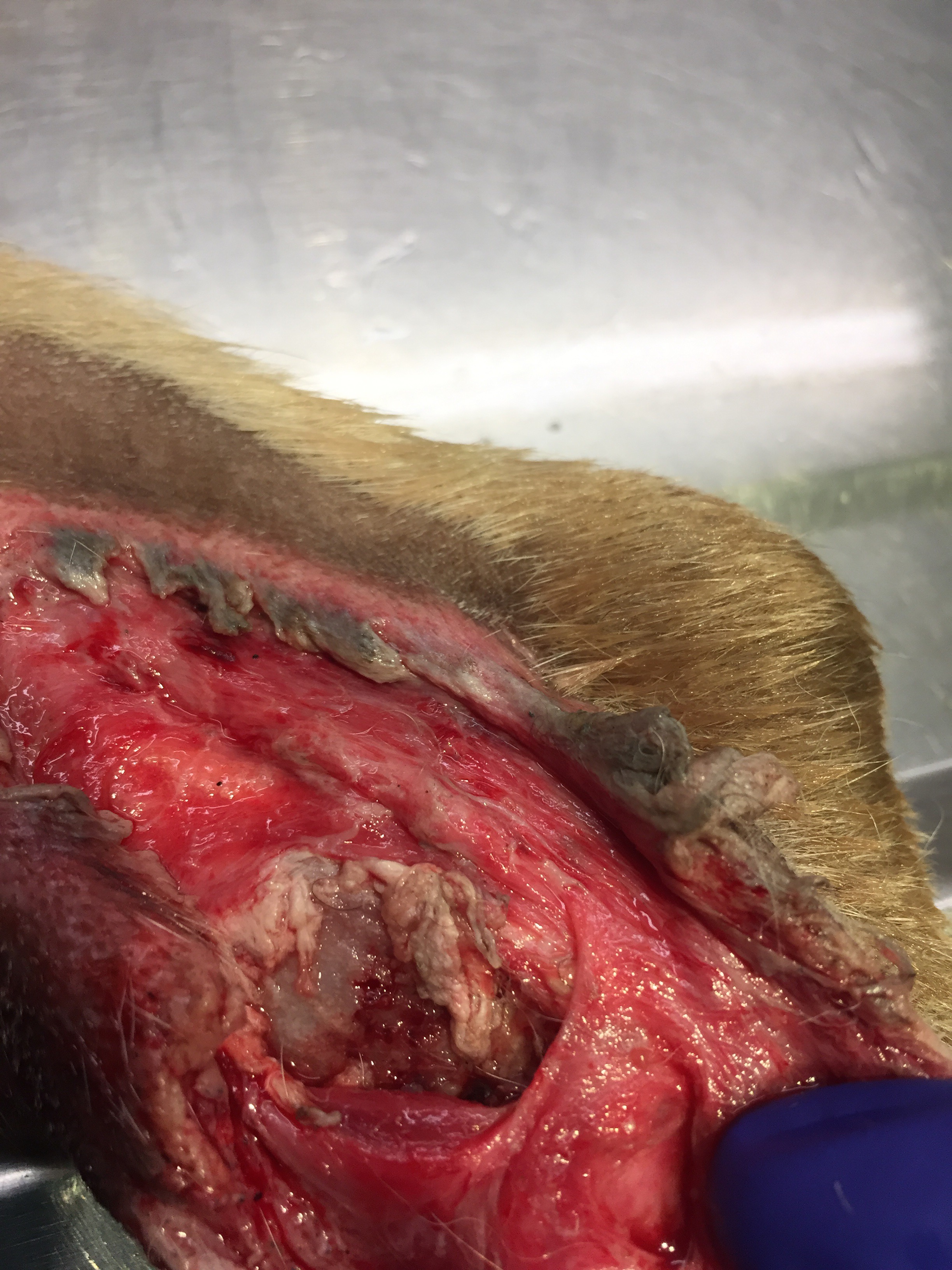 4. Almost every laceration repair needs to be done under sedation or even general anesthesia. This German Shepherd had to be under general anesthesia so that I could flush it properly. Infection in the bone is so very difficult to heal. Thoroughly flushing, picking out debris and bone fragments, and suturing only happens under general anesthesia.