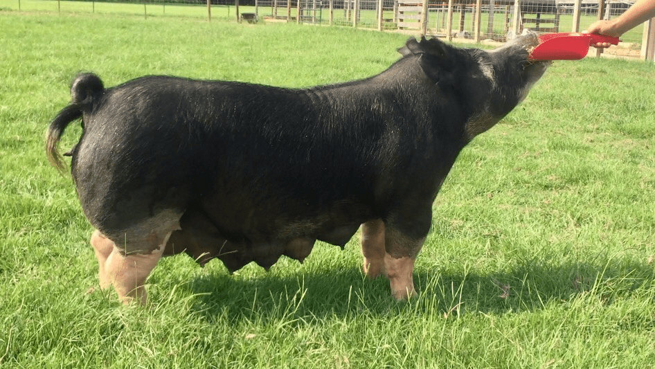 The next sow is a Berkshire, a breed known for especially tender and juicy meat. Berkshires are black with white legs/feet and a small amount of white on the face. Her name is Bob.