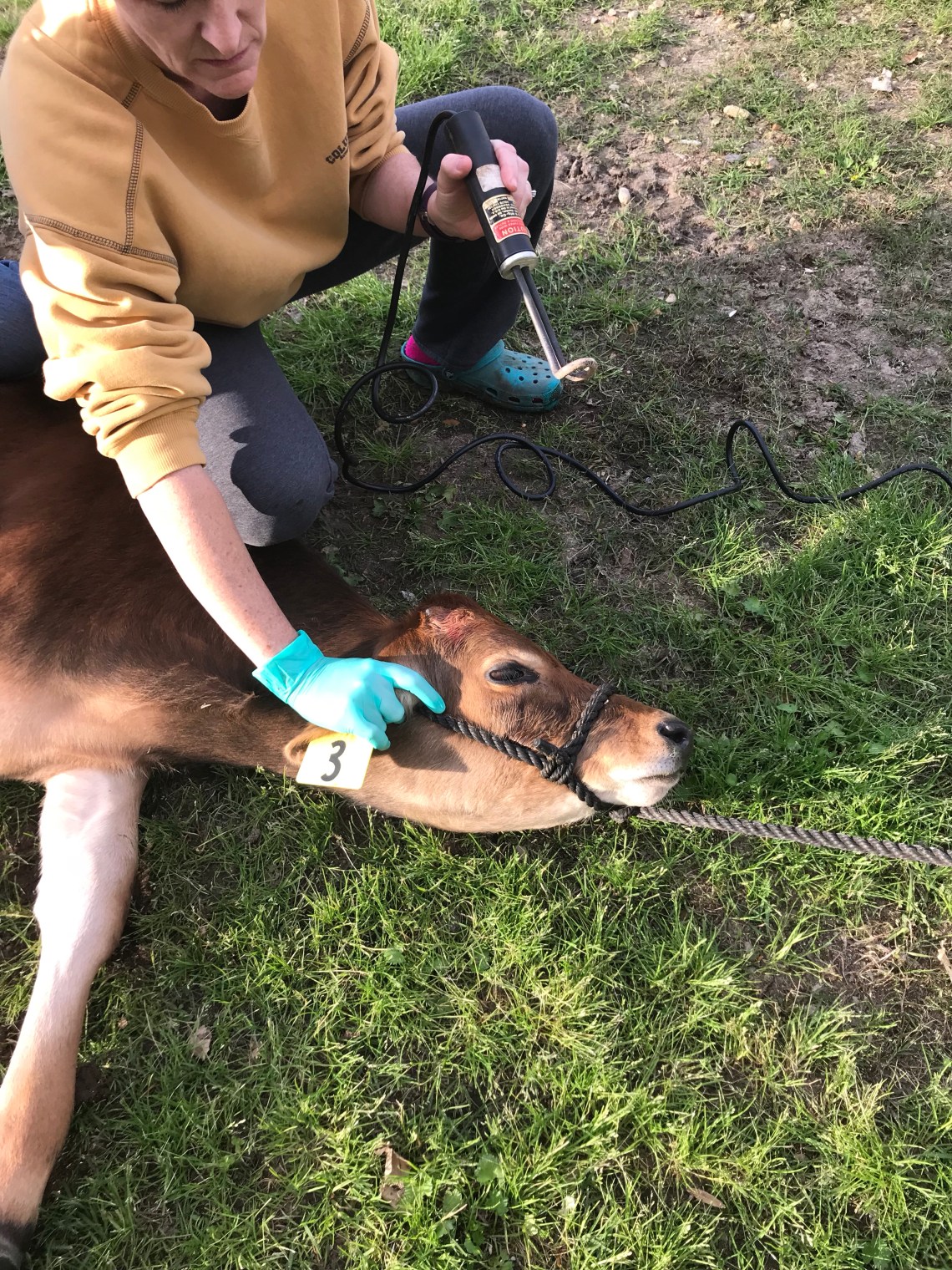 The electric dehorning tool gets extremely hot, so I place local blocks to both horns.