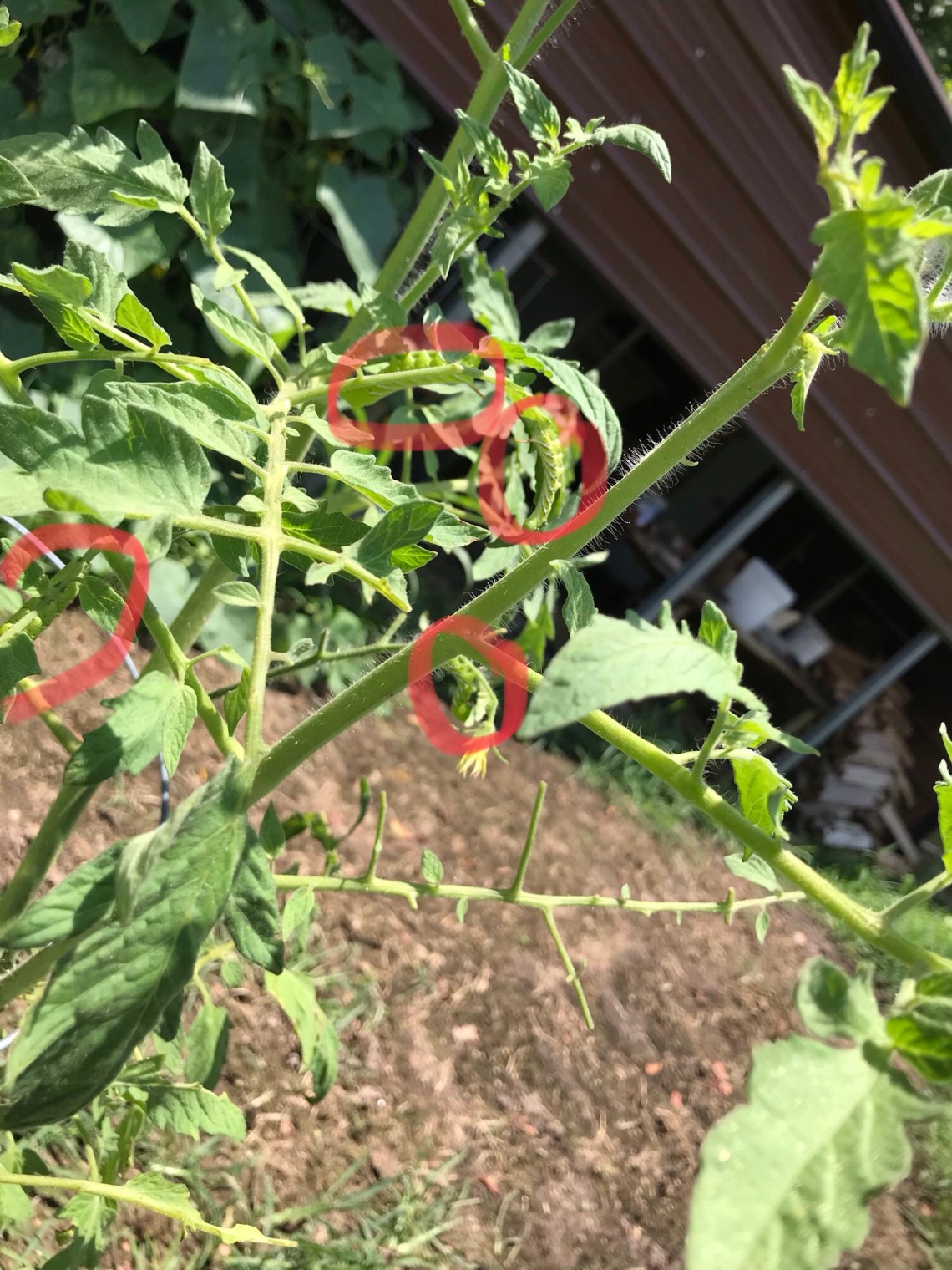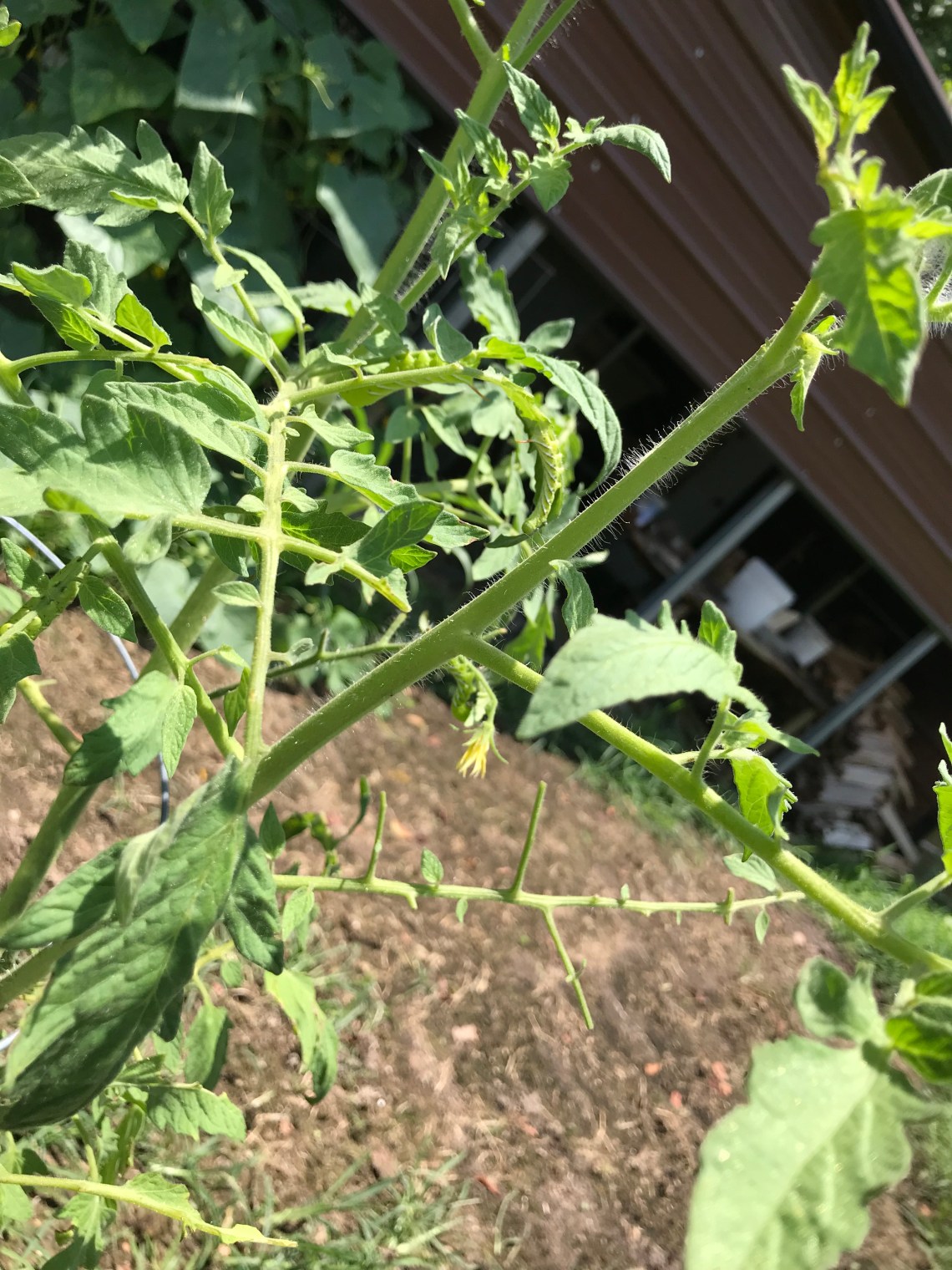 Picking green tomato hornworms off my tomatoes.