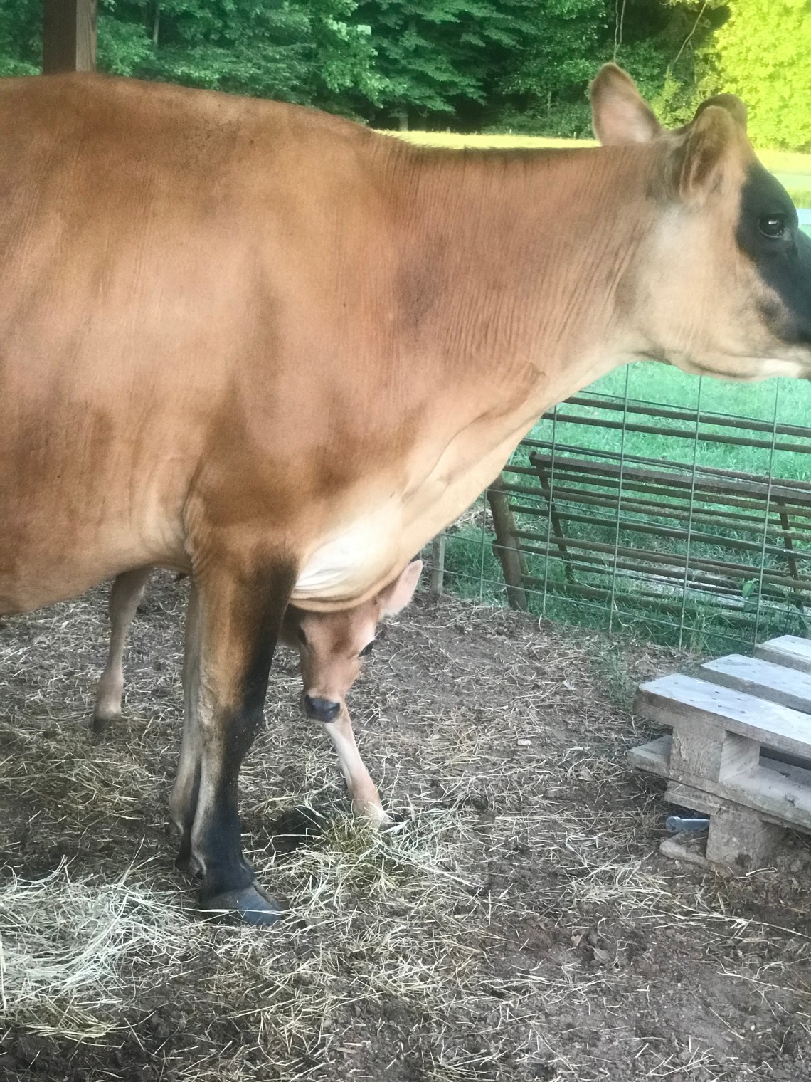 As you can see, this 8 yr old Jersey cow will produce much more milk than this little girl can drink. Tomorrow I will go to a friend’s dairy farm to pick up a second calf to help drink the milk, therefore preventing mastitis.
