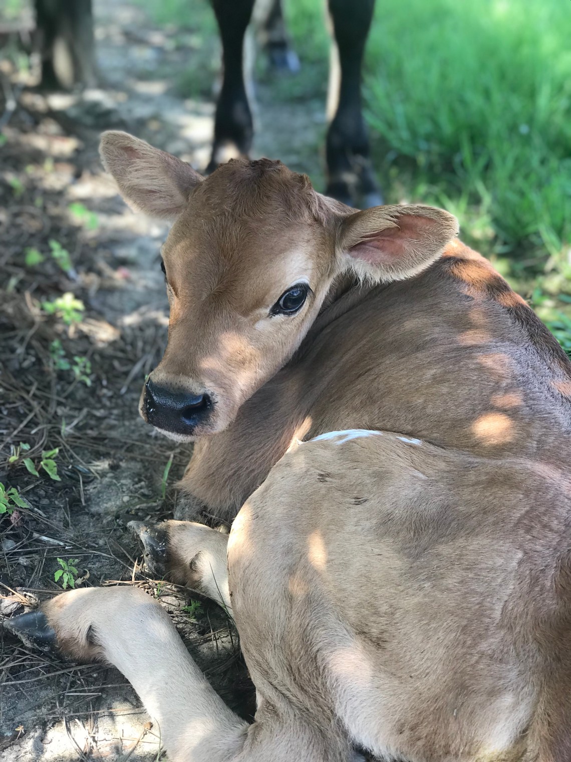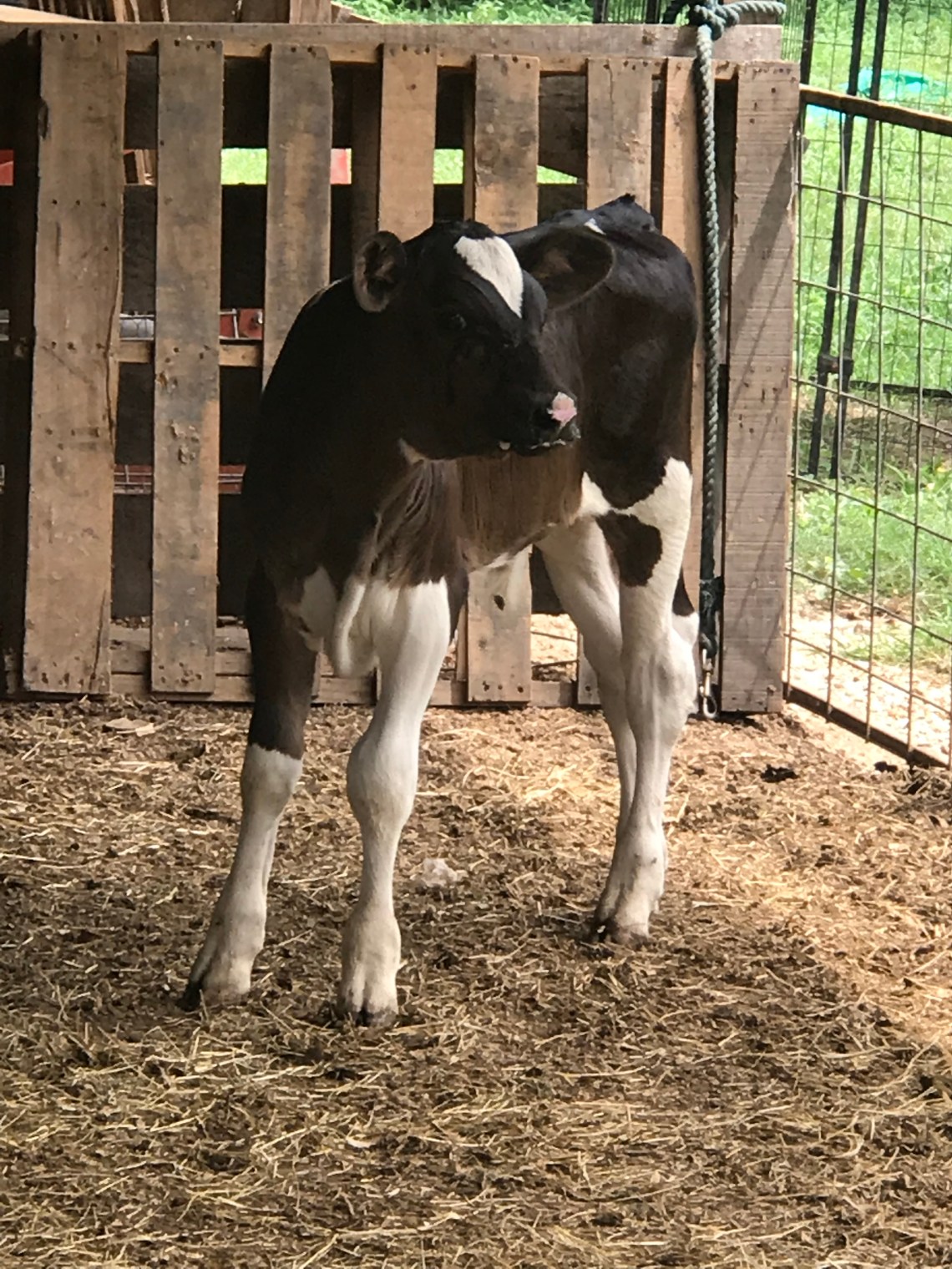 We went to our friend’s dairy and picked up a 3 week old Holstein/Jersey bull calf.