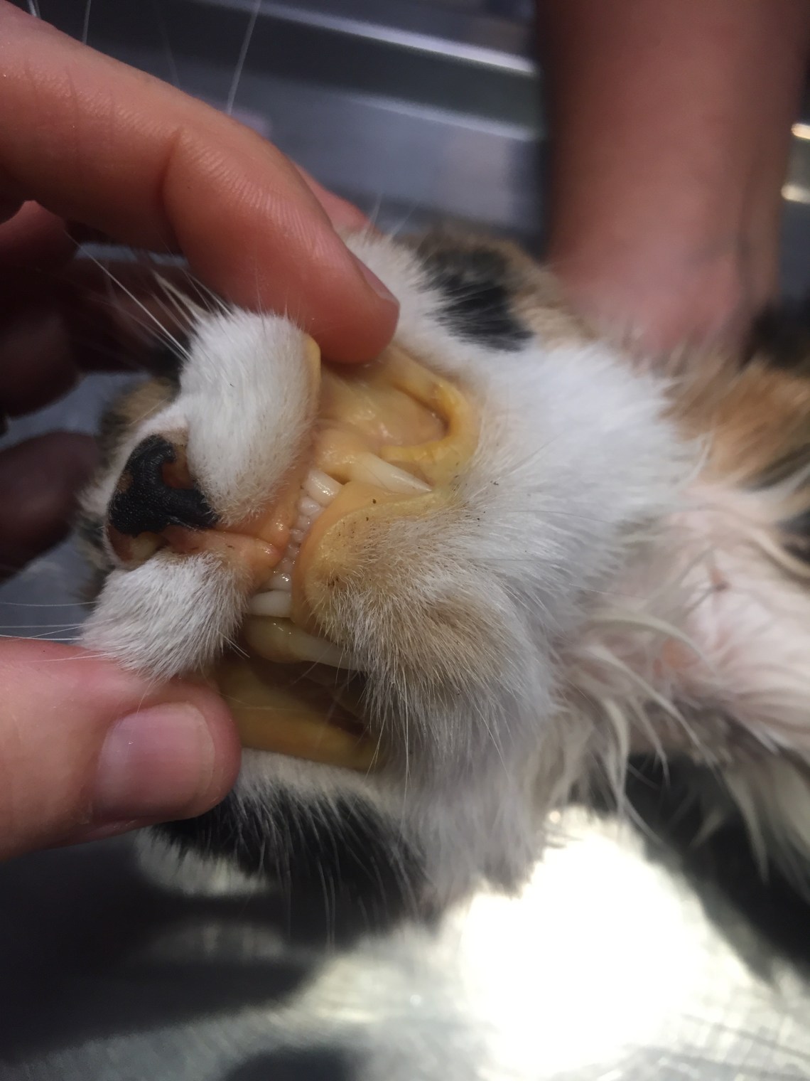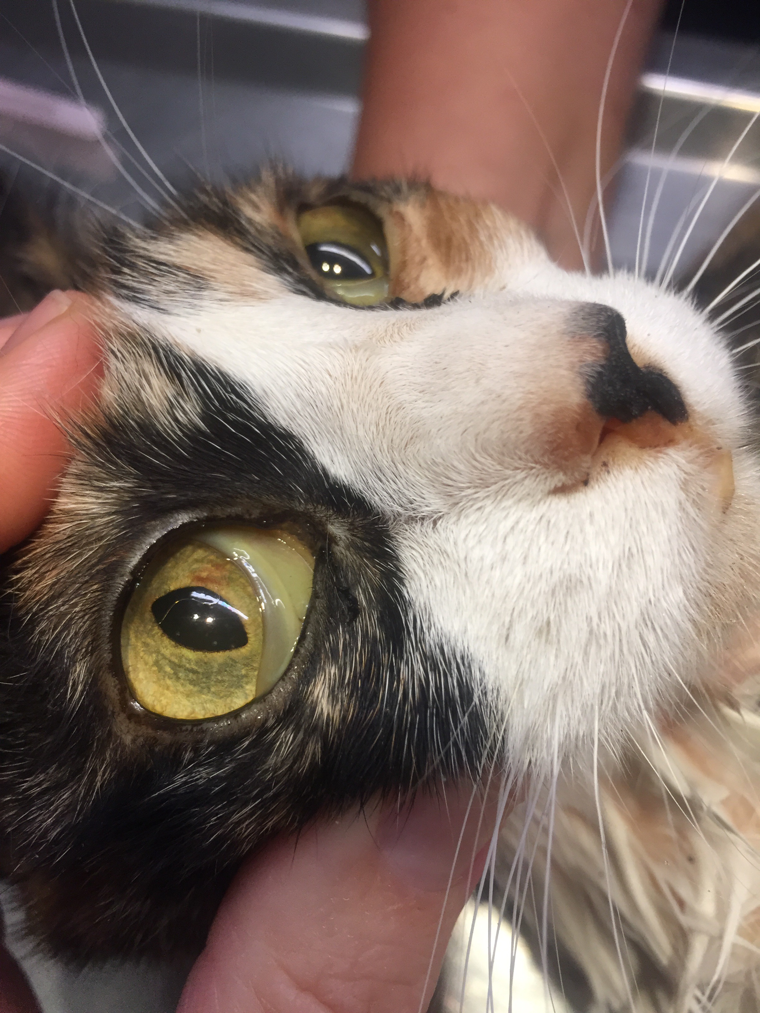This cat was hiding under the owner’s bed for 3 days before they could manage to get her out and to the veterinarian. Can you see that 3rd eyelid? Can you appreciate how very yellow it is?