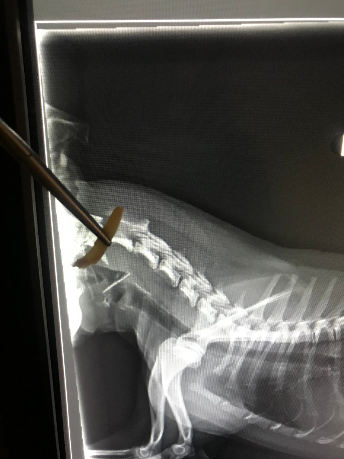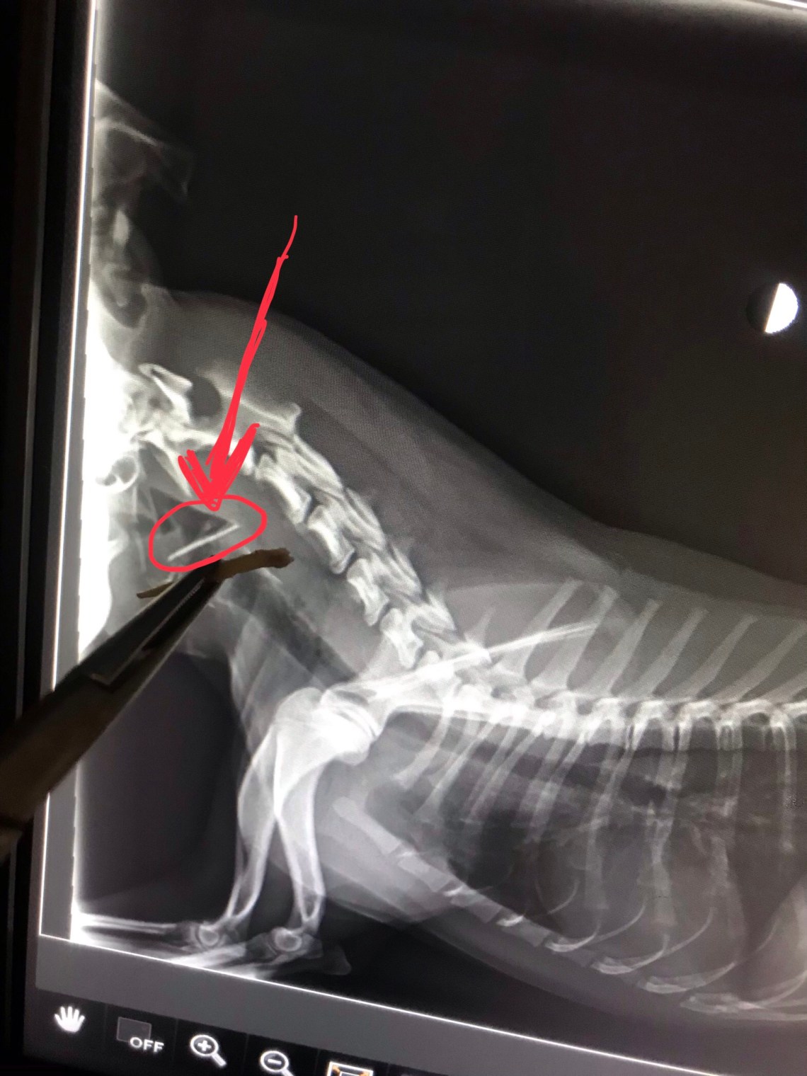 Here is a photo of a radiograph that includes the shard of chicken bone that was lodged in this dog’s throat.