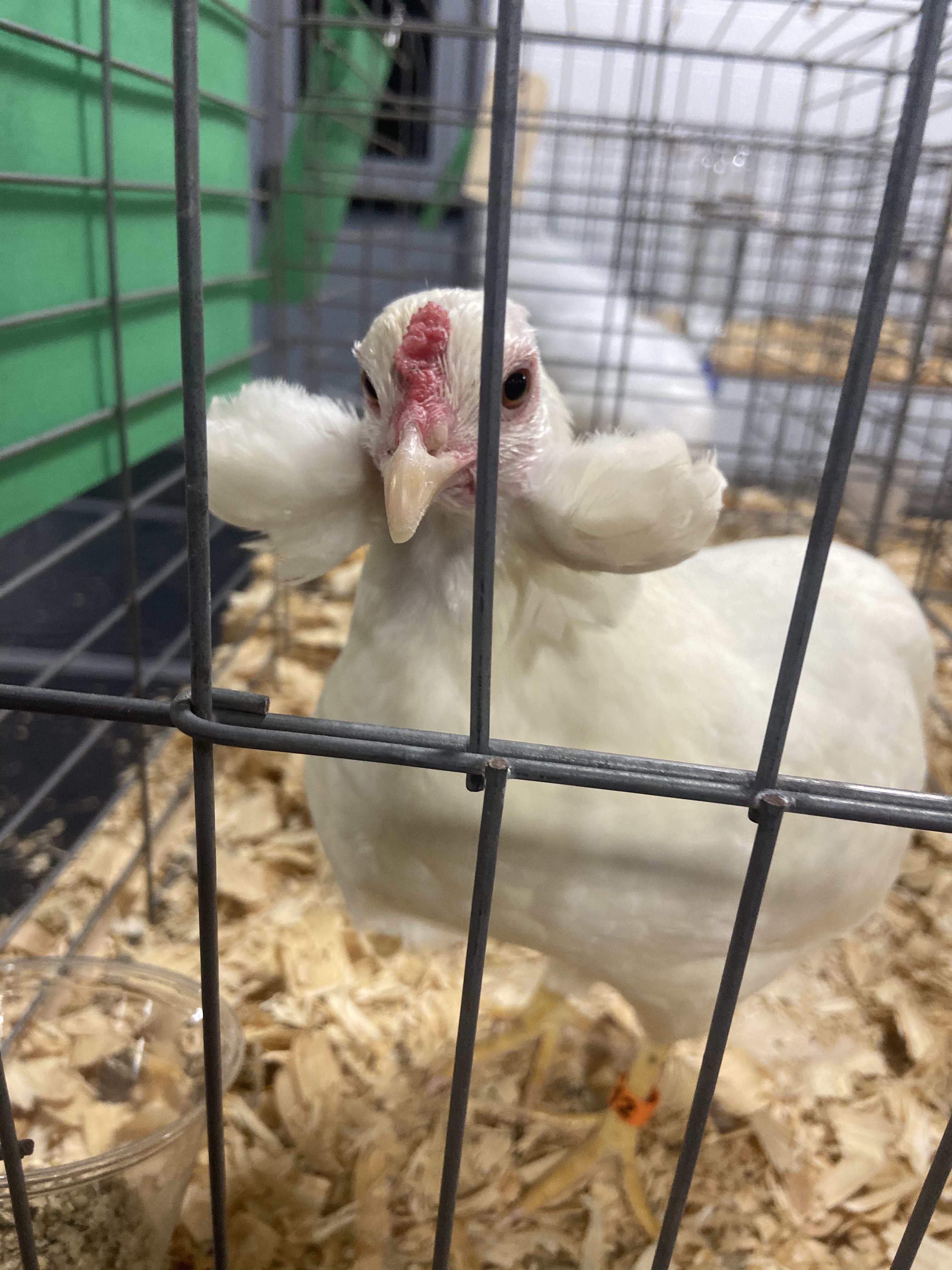 Araucana – white – bantam. I know some men who would be jealous of that facial feature.