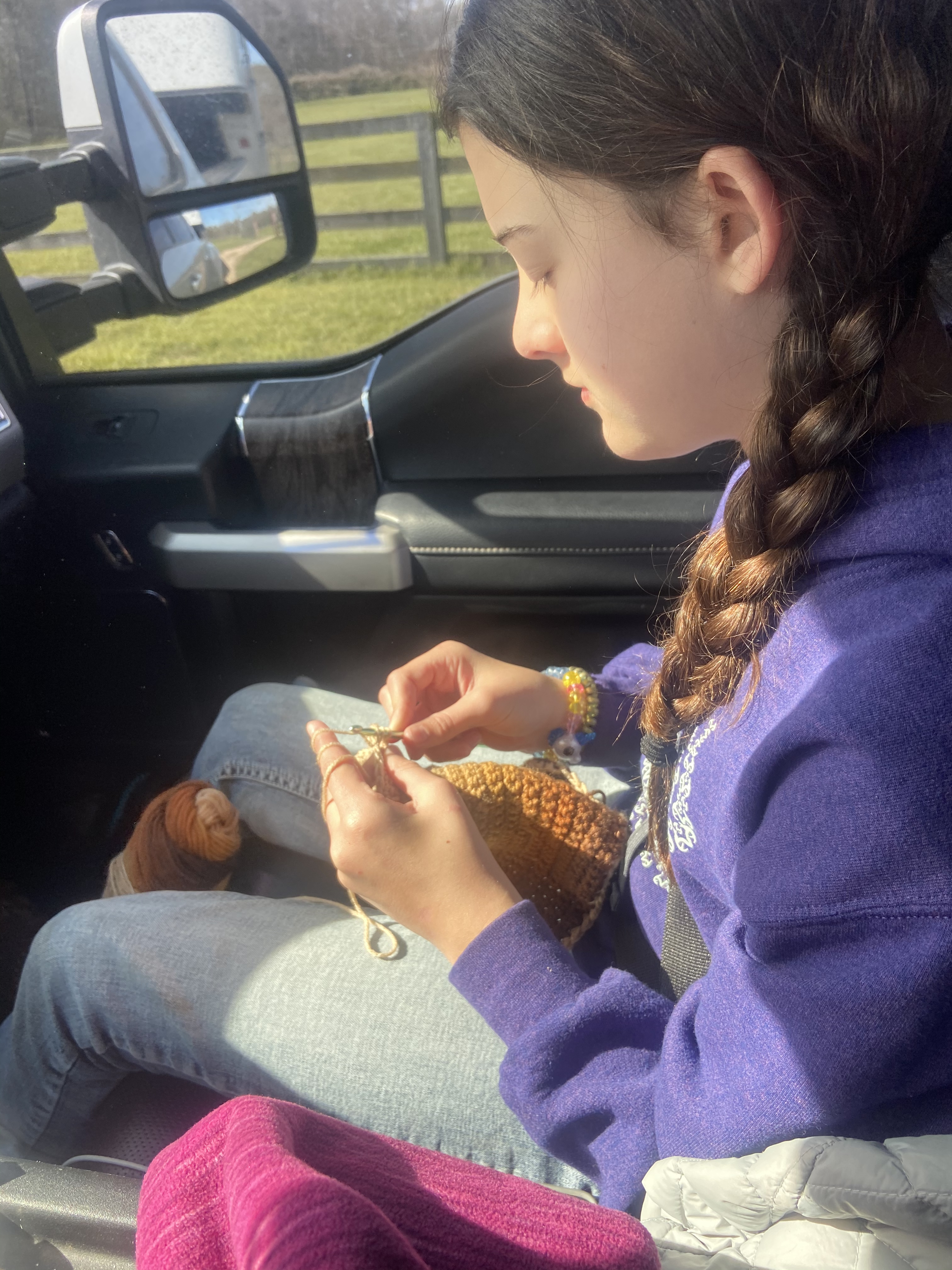 In our homeschool co-op, we have a mom teaching the girls how to crochet. Landry has taken to it and loves it. This is her crocheting on the drive to Gonzales to her barrel lesson.
