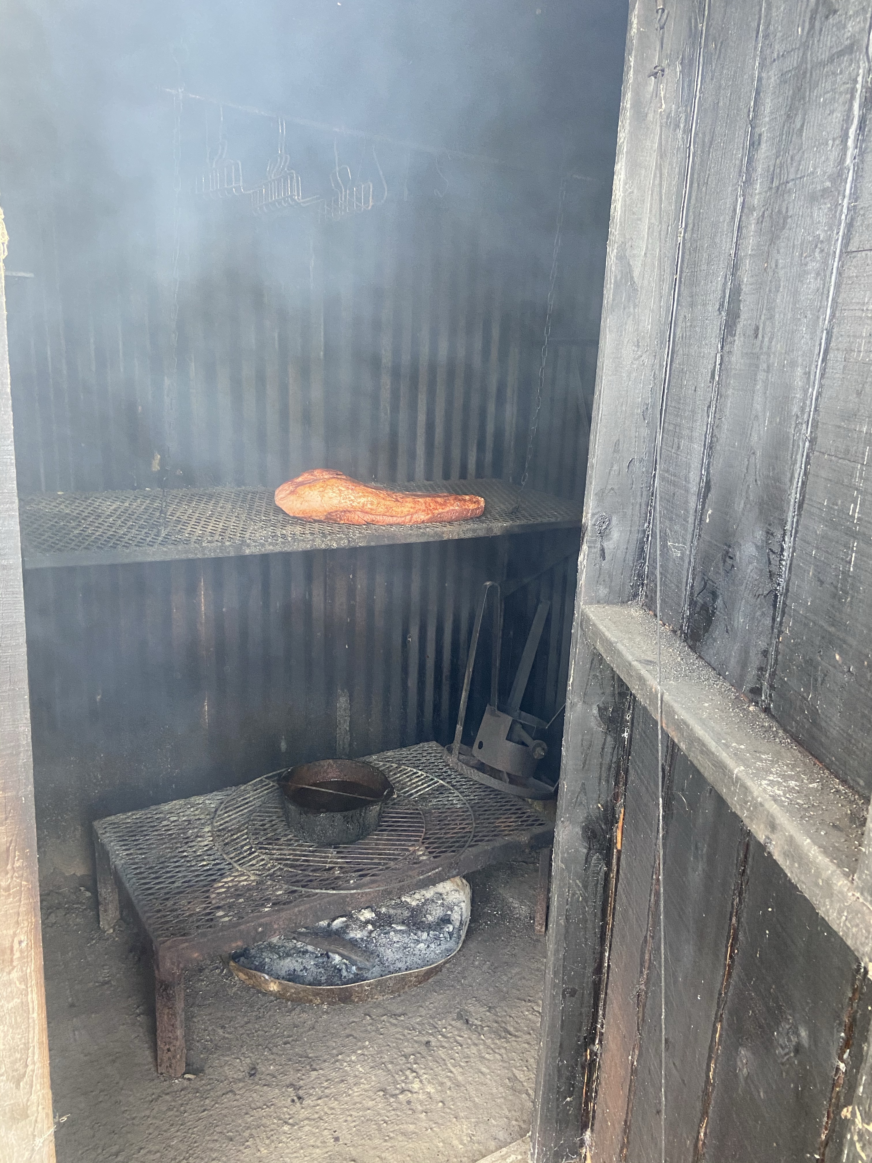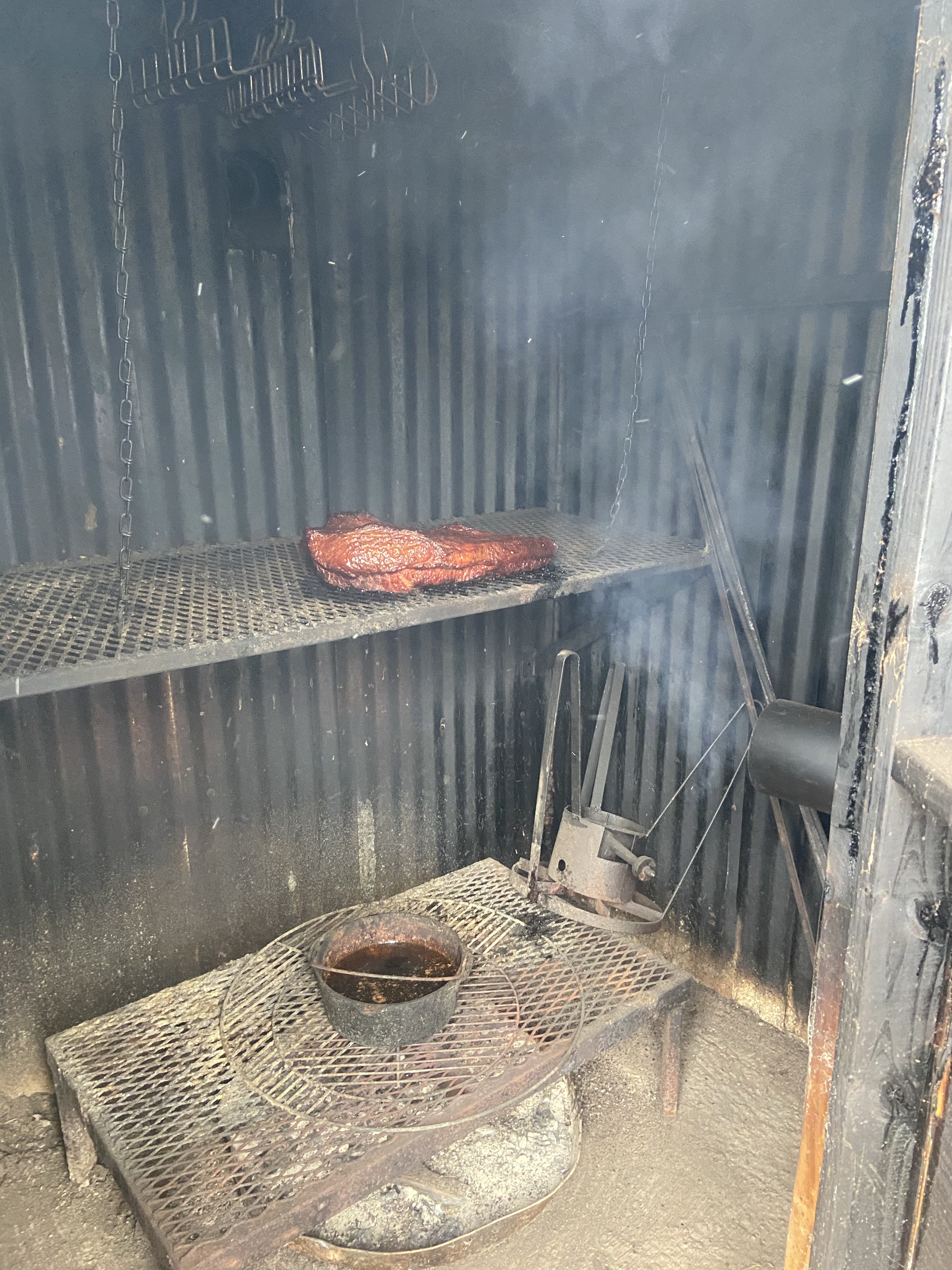 This is the brisket at 3:55 pm, about 5 hours later. We are looking for a “bark” on the outside of the brisket. In this photo, you can see the smoke coming in from the wood stove outside.