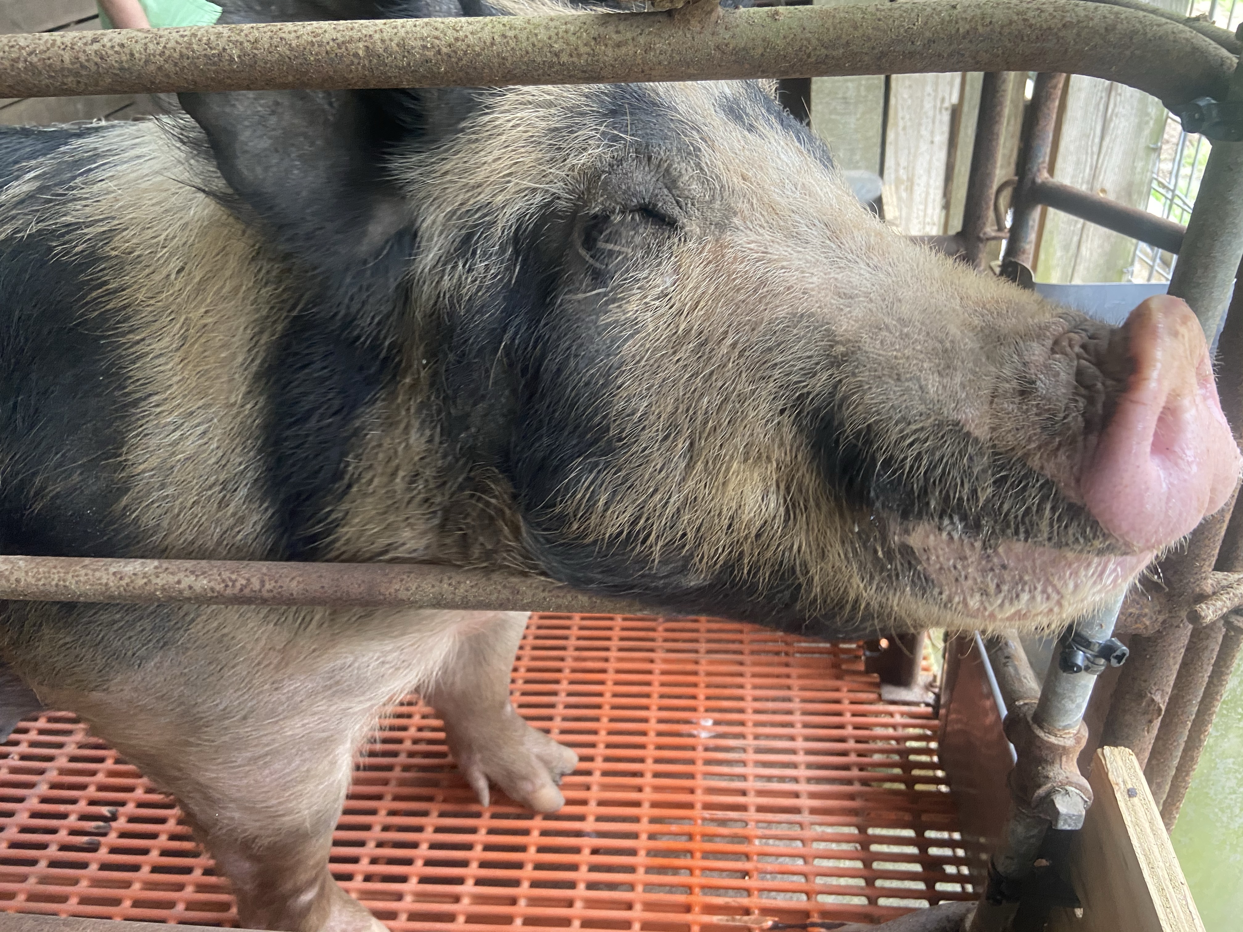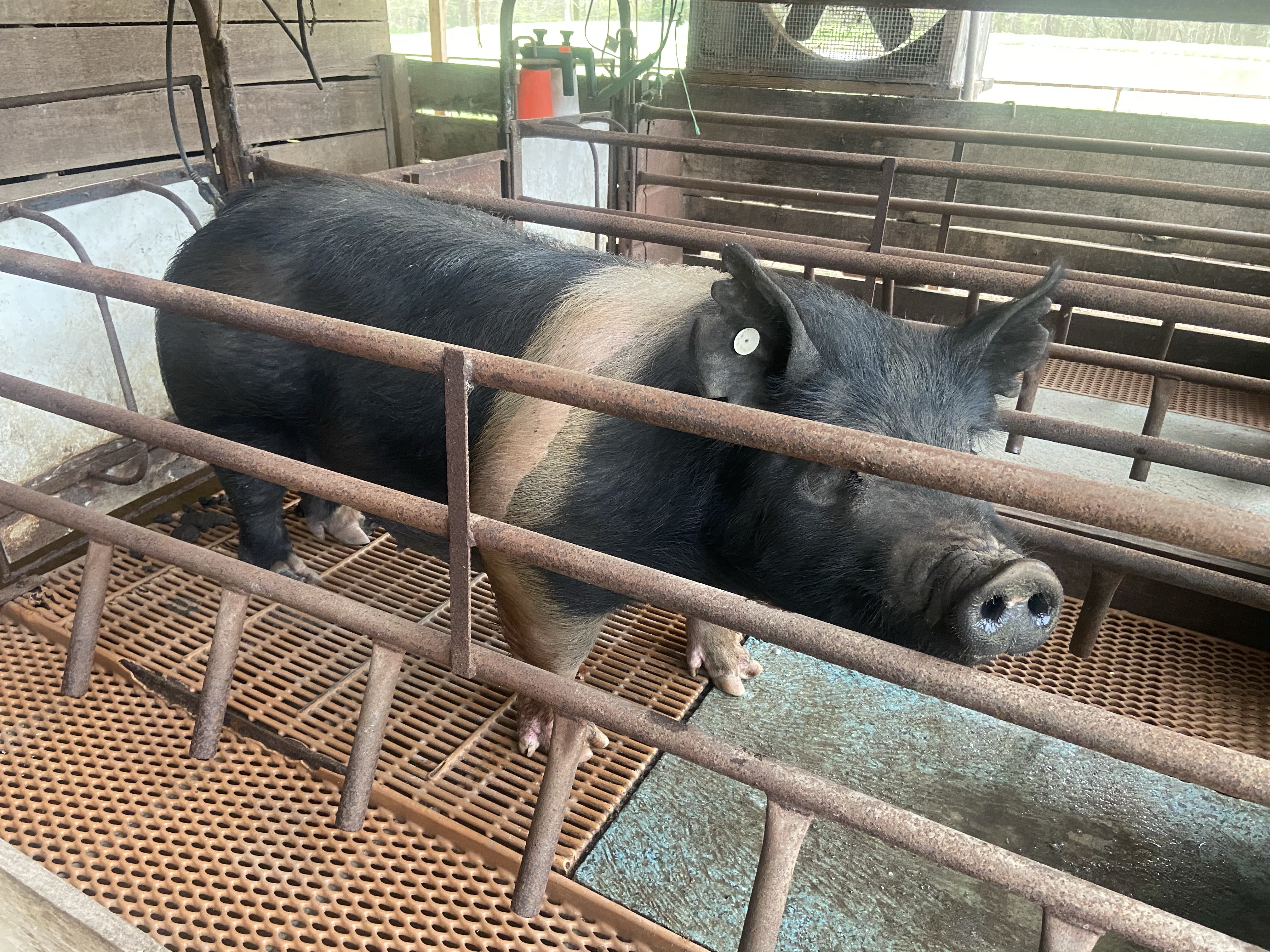 While it was smoking, we moved our two pregnant sows into the farrowing crates. These crates have “safe spaces” for the piglets to get away when the sow tries to lay down.