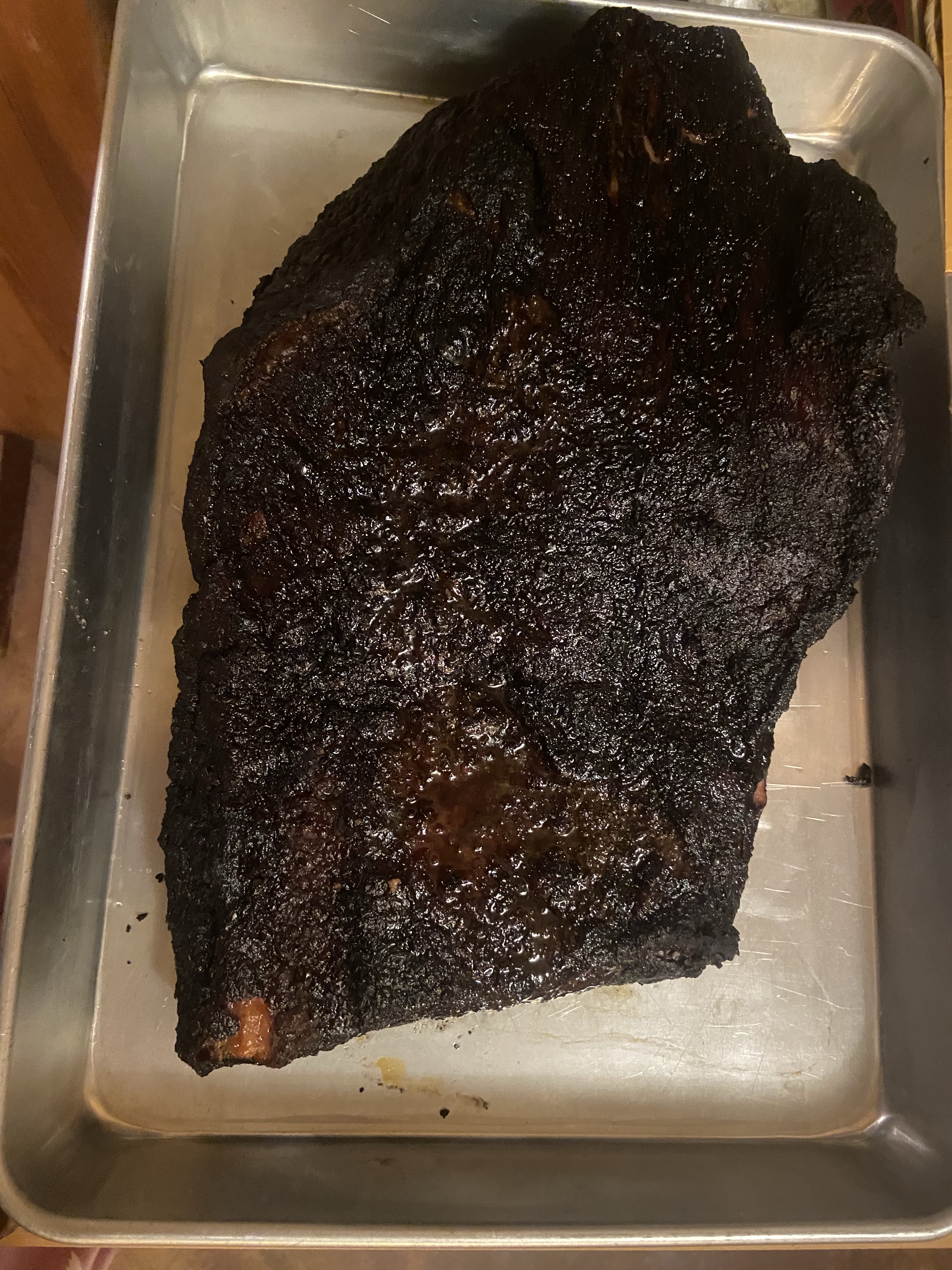 We continued barn chores, grass cutting, laundry, and more. We decided to take the brisket out at 8:40 pm, after 11 hours in the smokehouse. Here’s the bark we were looking for:
