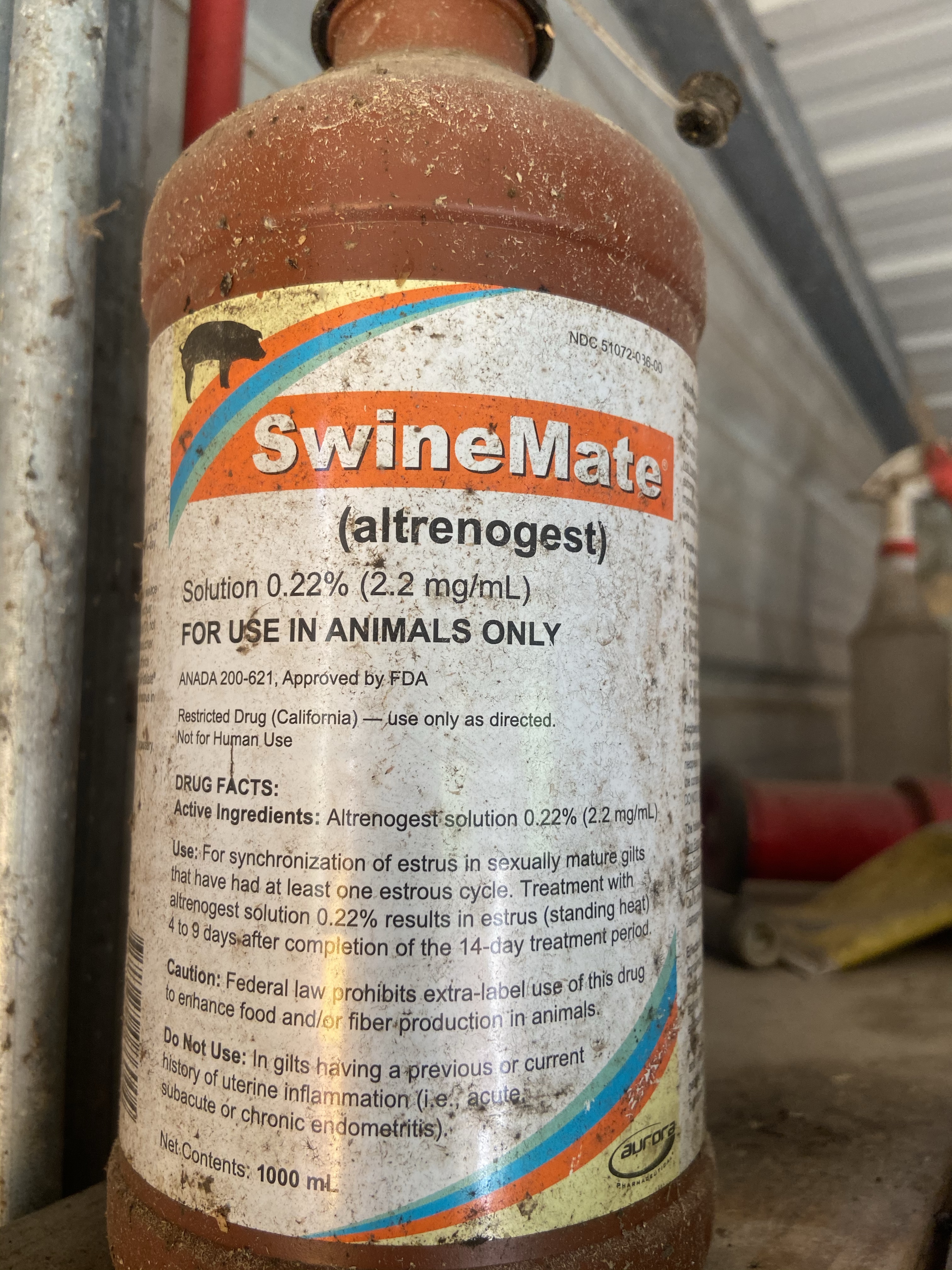When the hormone administration is withdrawn, the gilt will begin to cycle and “stand” in 3-5 days on average. When the gilts are finicky, we will put the medication onto a hamburger bun, which soaks up the liquid well and the gilts enjoy the bread treat.