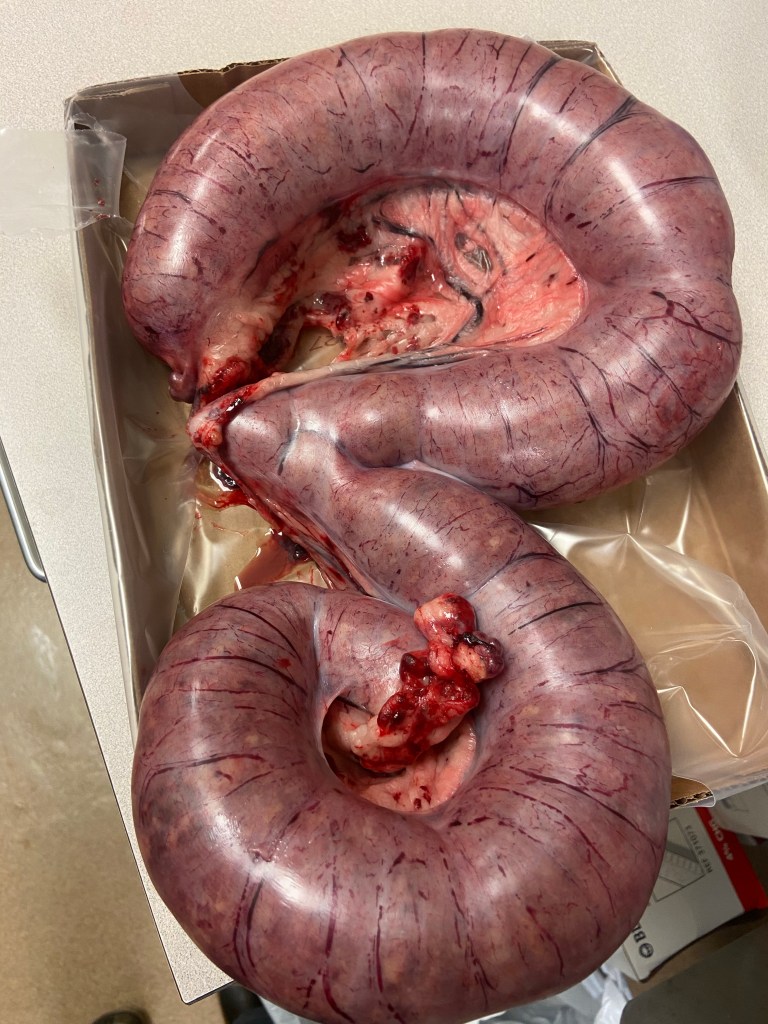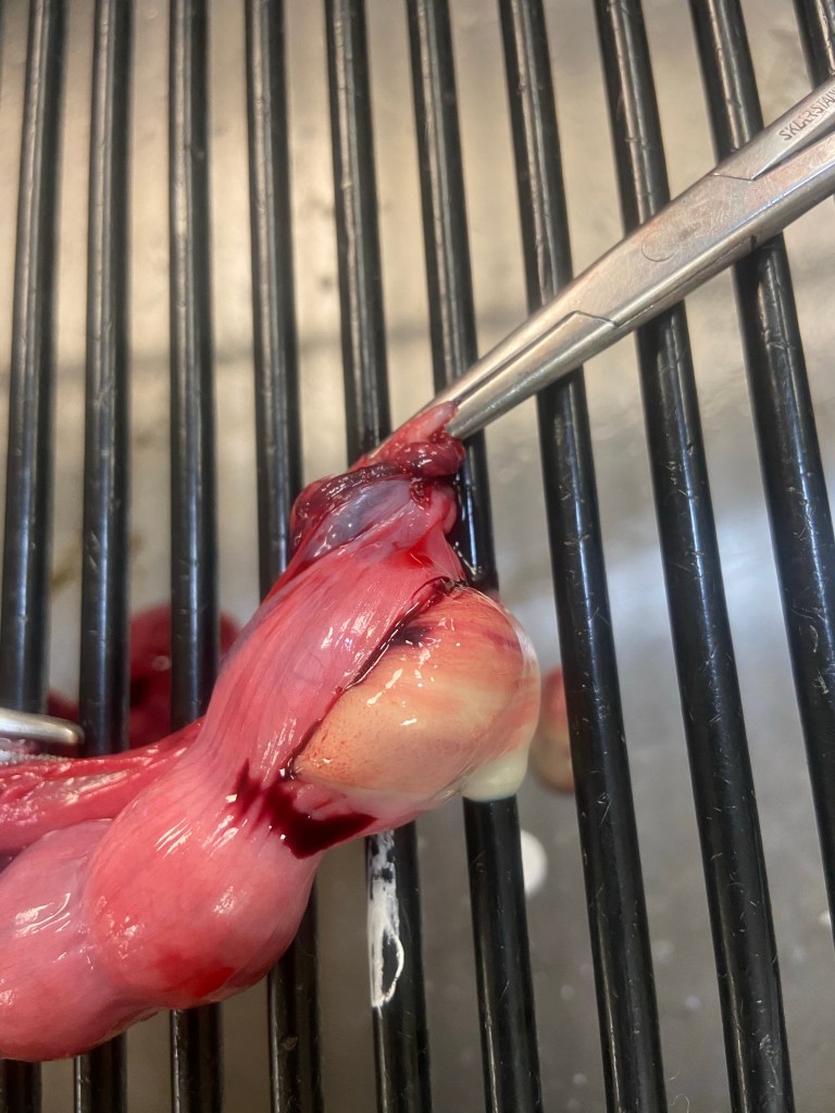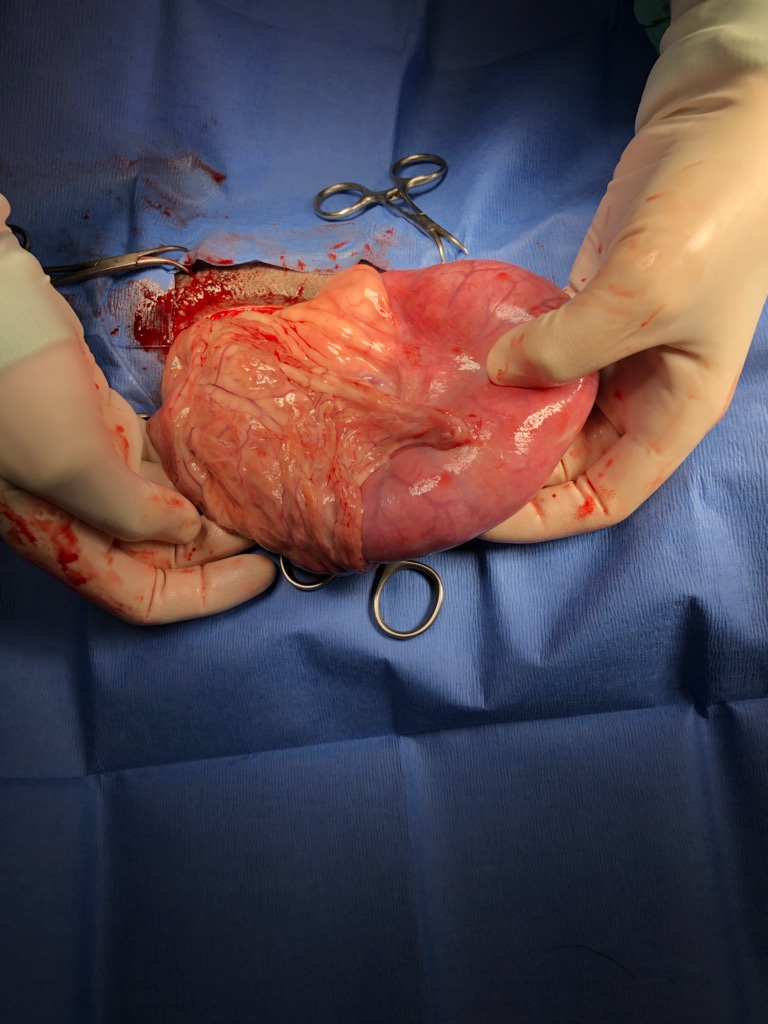 You can see the omentum (the “webbing”) attached to the uterus. It is plugging a hole.