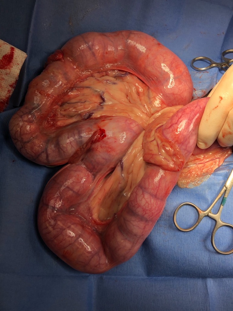 You can see the omentum (the “webbing”) attached to the uterus. It is plugging a hole.