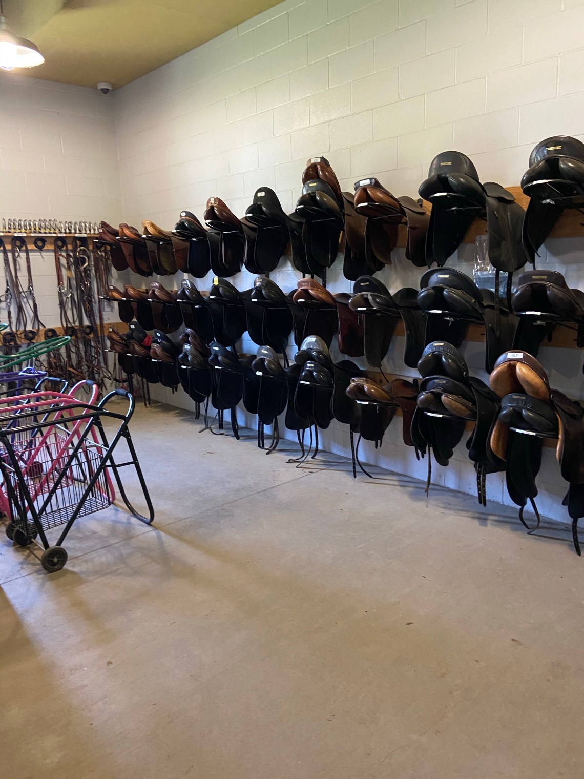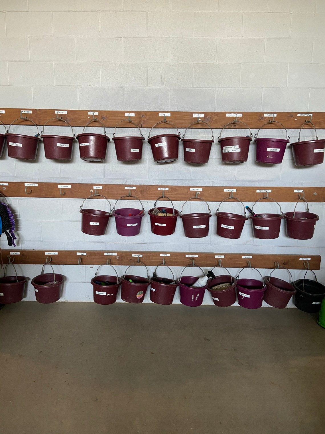 Each horse has its own bucket with brushes and a hoof pick. This keeps cross contamination to a minimum. If one horse get sick, the germs aren’t spreading from grooming supplies.