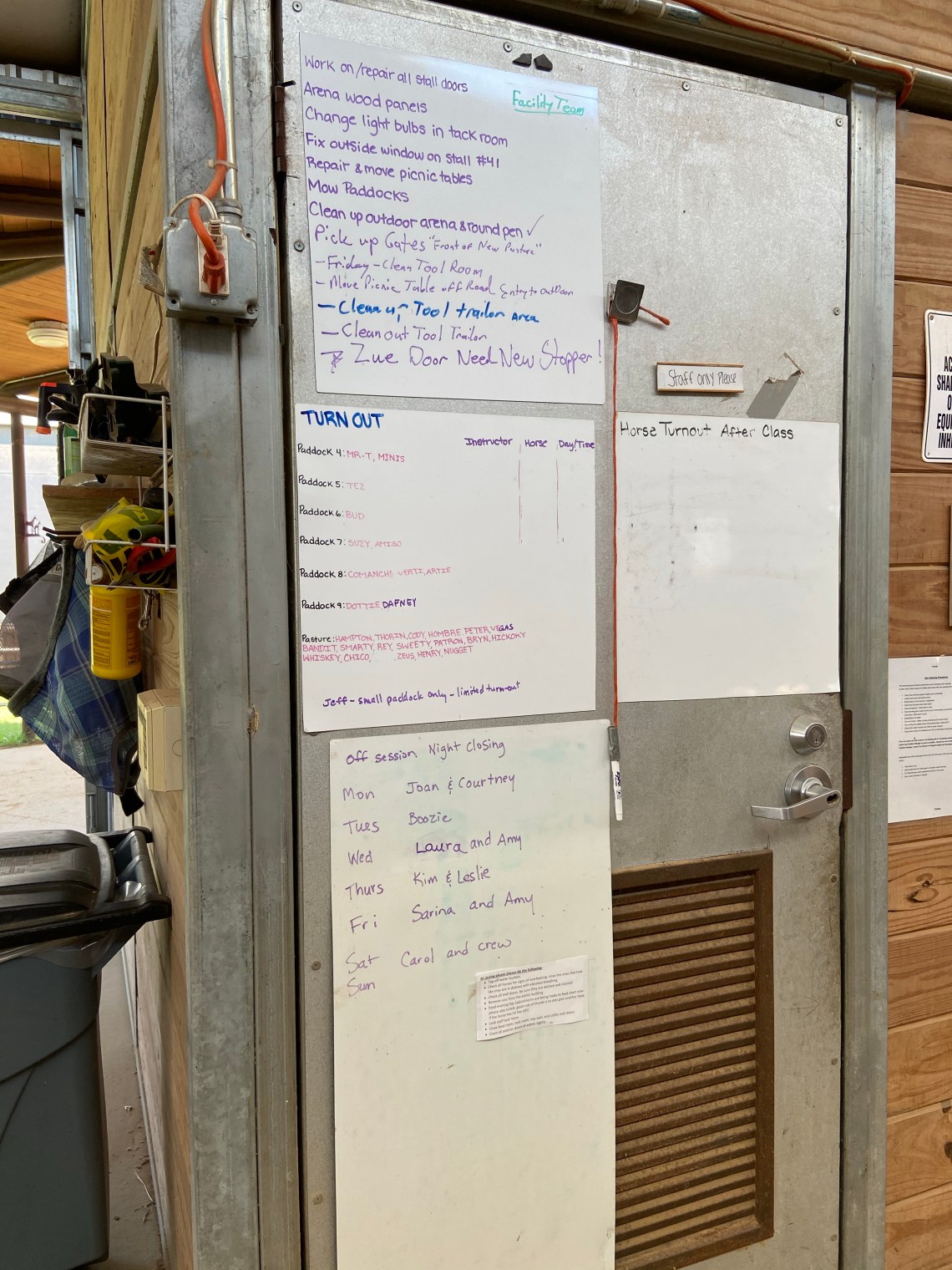 Each horse has its own stall, with a turnout schedule. Please notice the list of repairs that need to be made. You don’t have to volunteer to work with the horses. General maintenance is always needed.