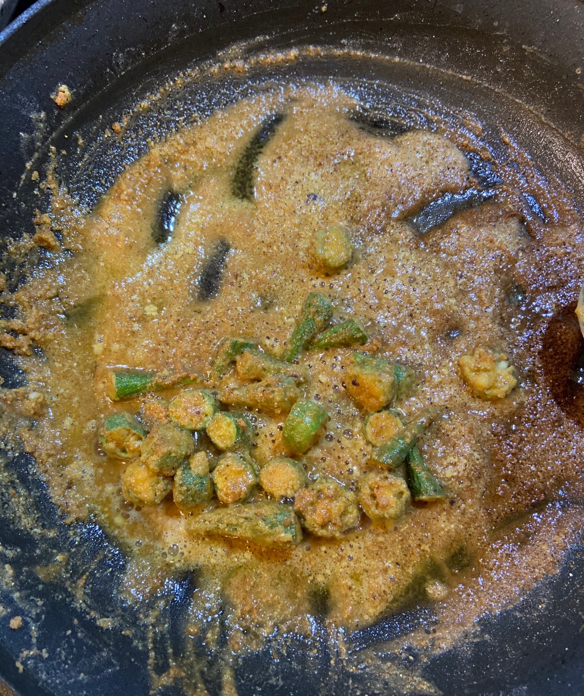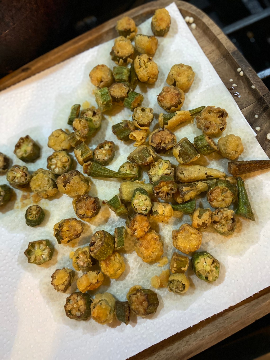 Since it’s only moisture from the okra holding the batter, a lot will fall off into the grease.