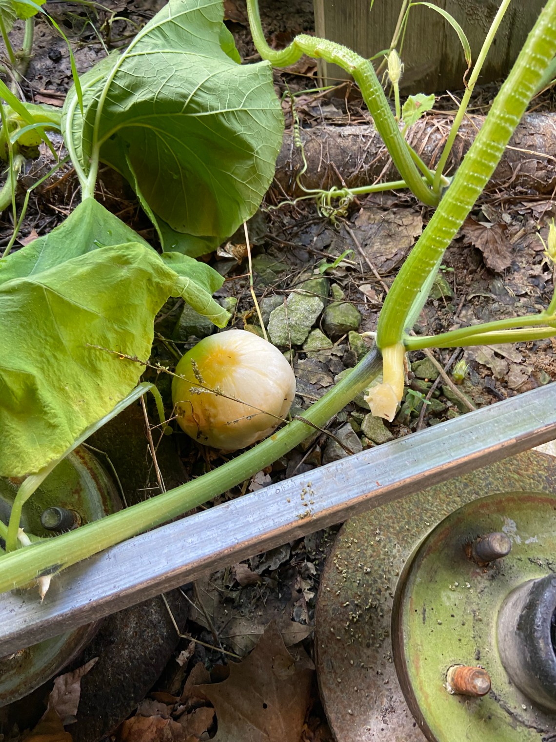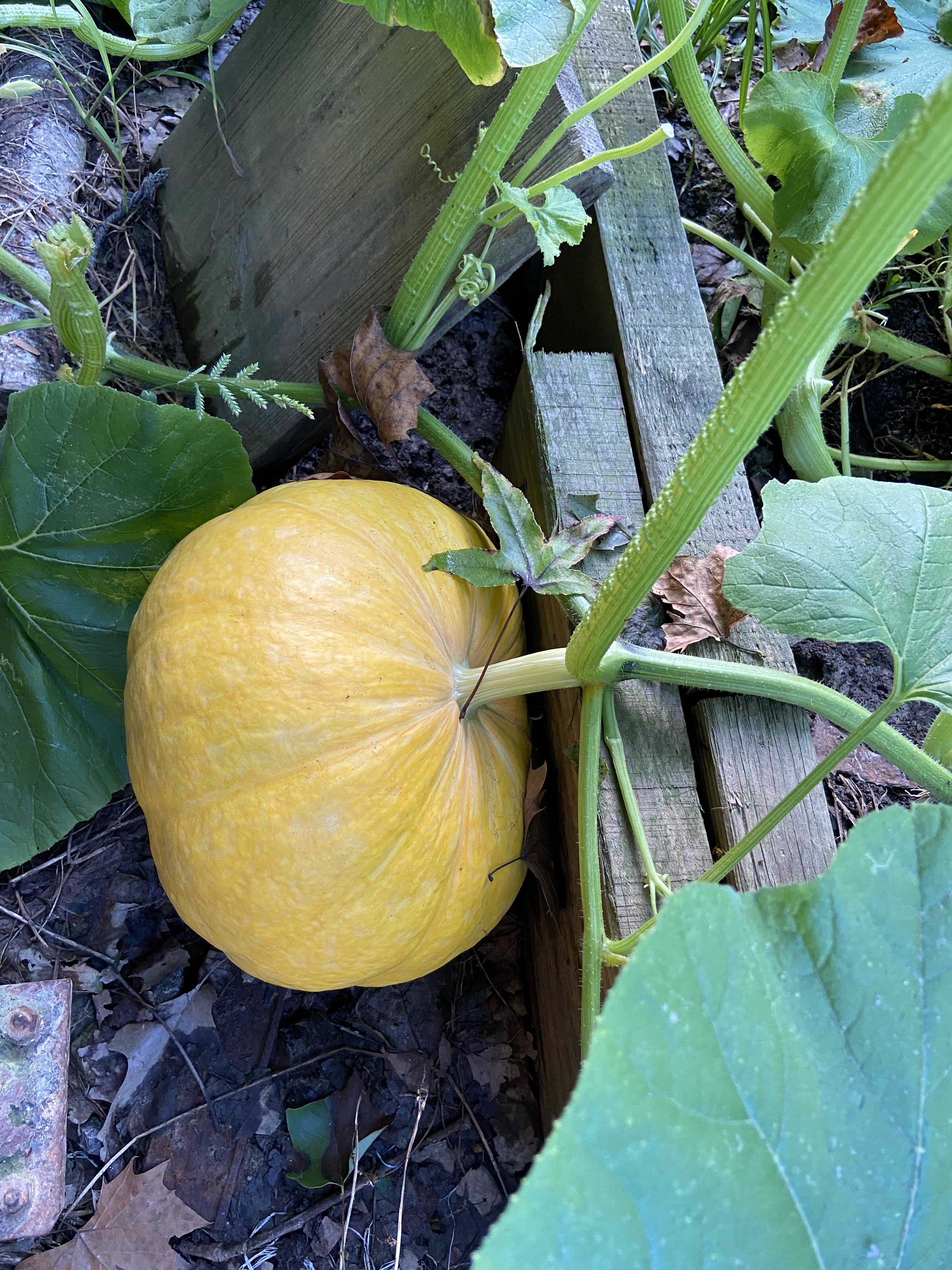 The plants are everywhere, but the pumpkins aren’t plentiful yet. We have one large one and that decided to grow early and healthy.