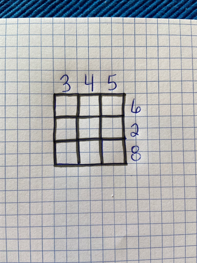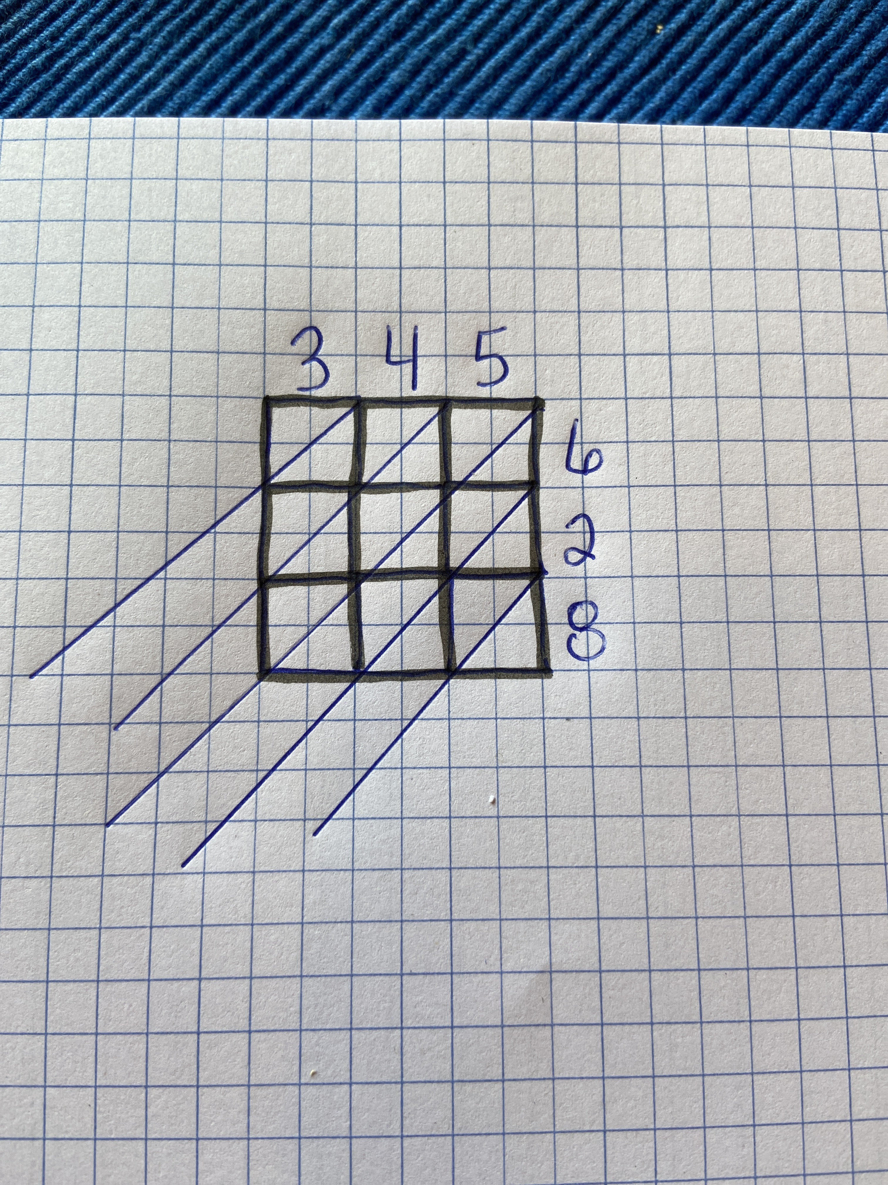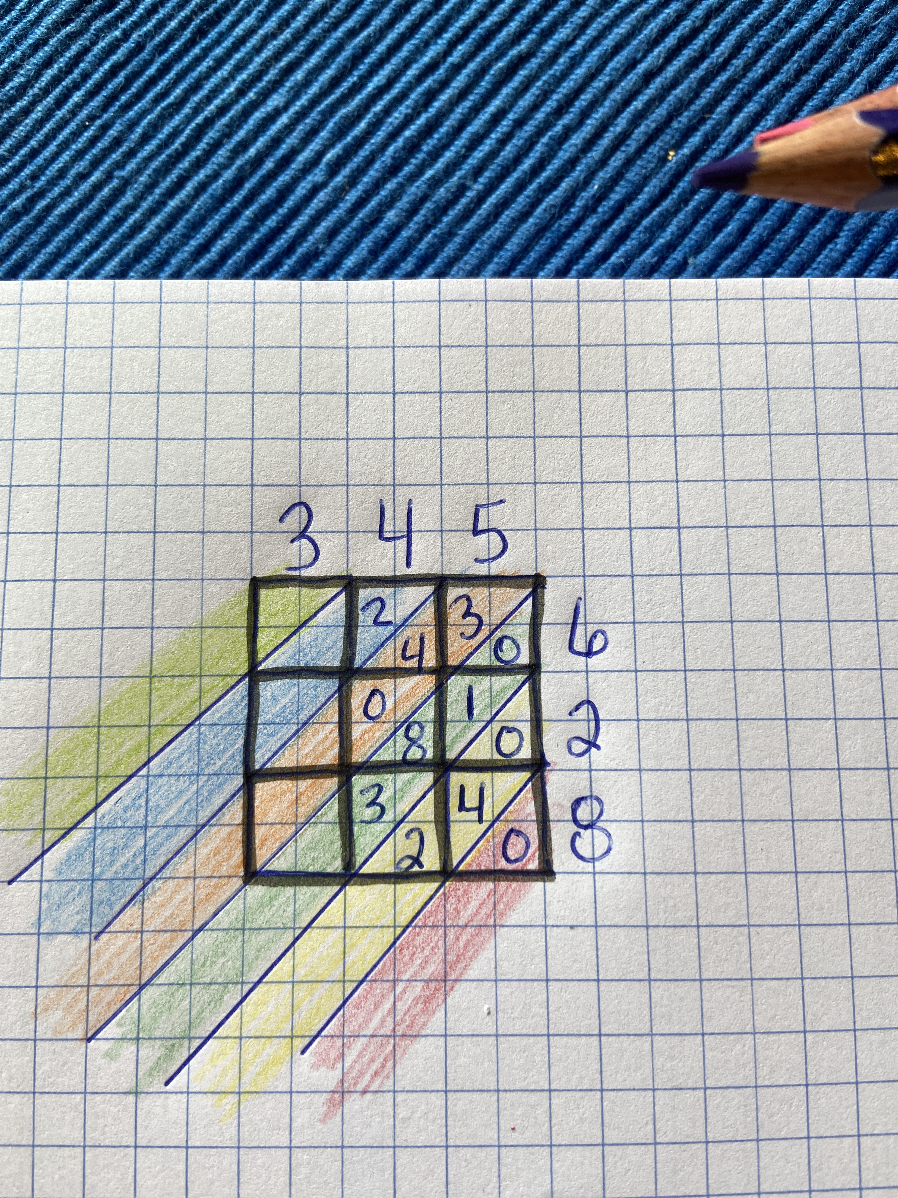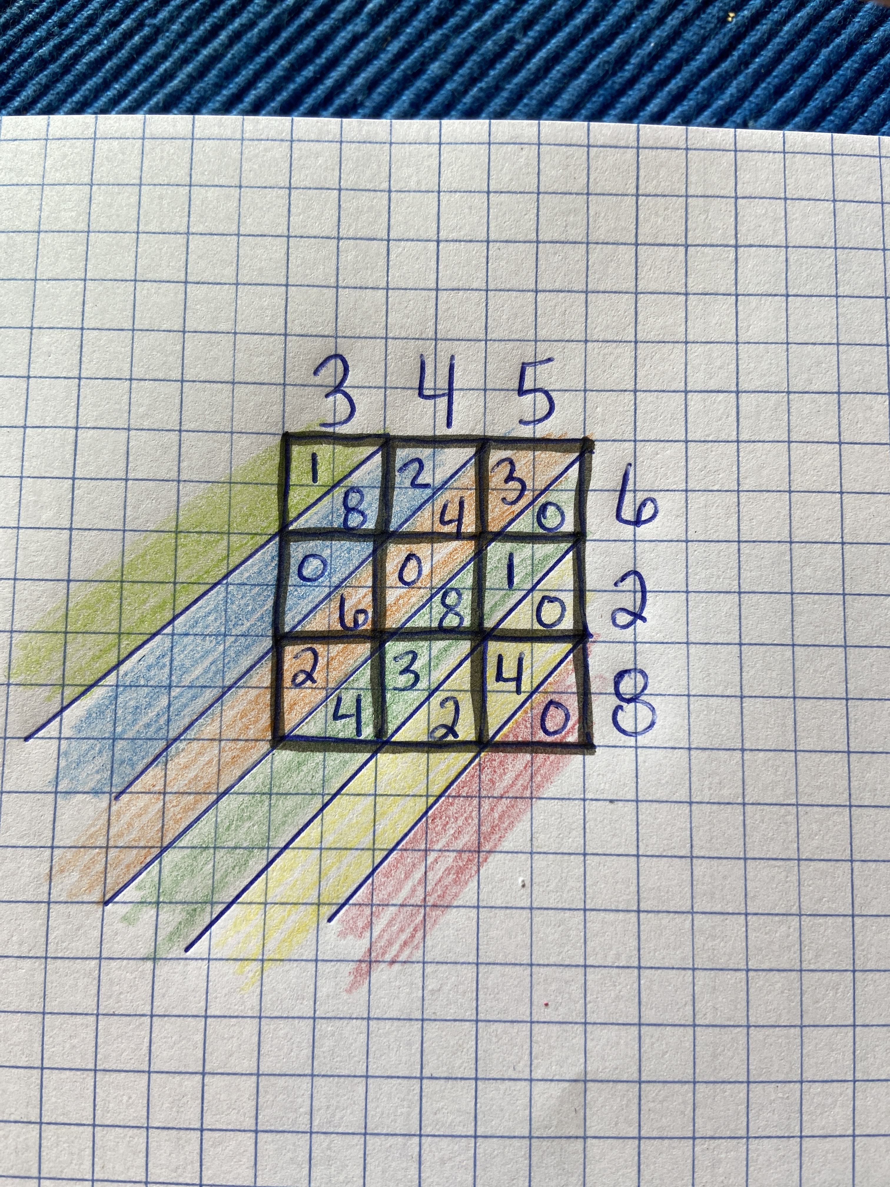 Now in the traditional way of multiplication, there’s a lot of moving and keeping things lined up. In block multiplication, it becomes a game similar to Battleship. Remember that game? It’s a grid.