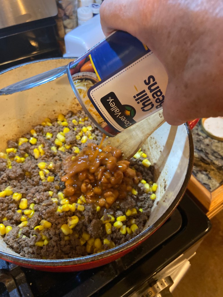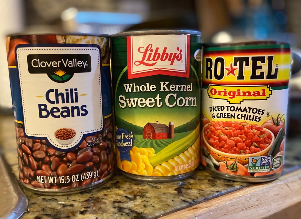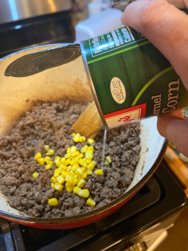 Add your corn. I drain and rinse with fresh water. My daughter loves corn, so she requested two cans.