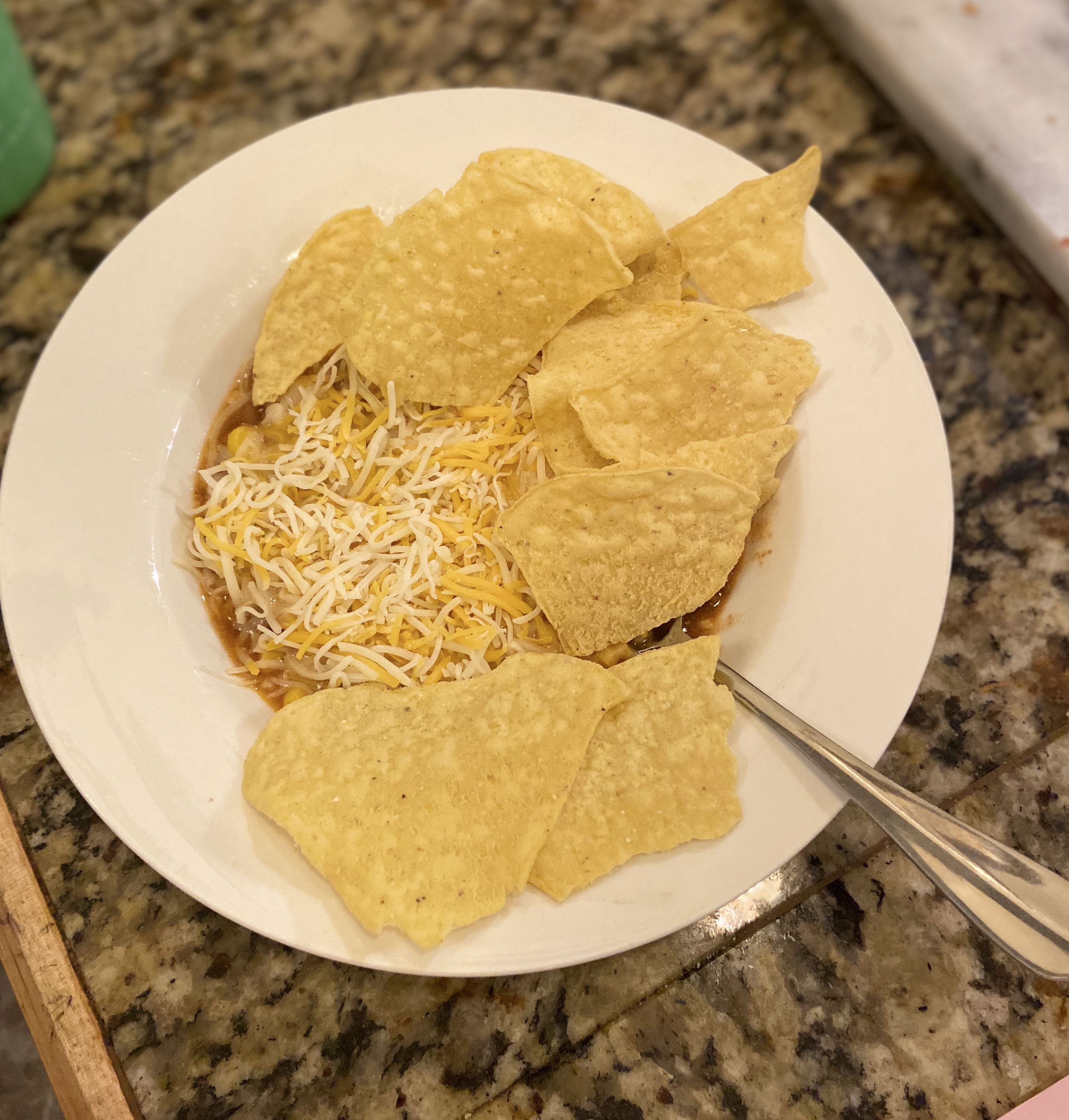 Serve with shredded cheese and tortilla chips or strips.