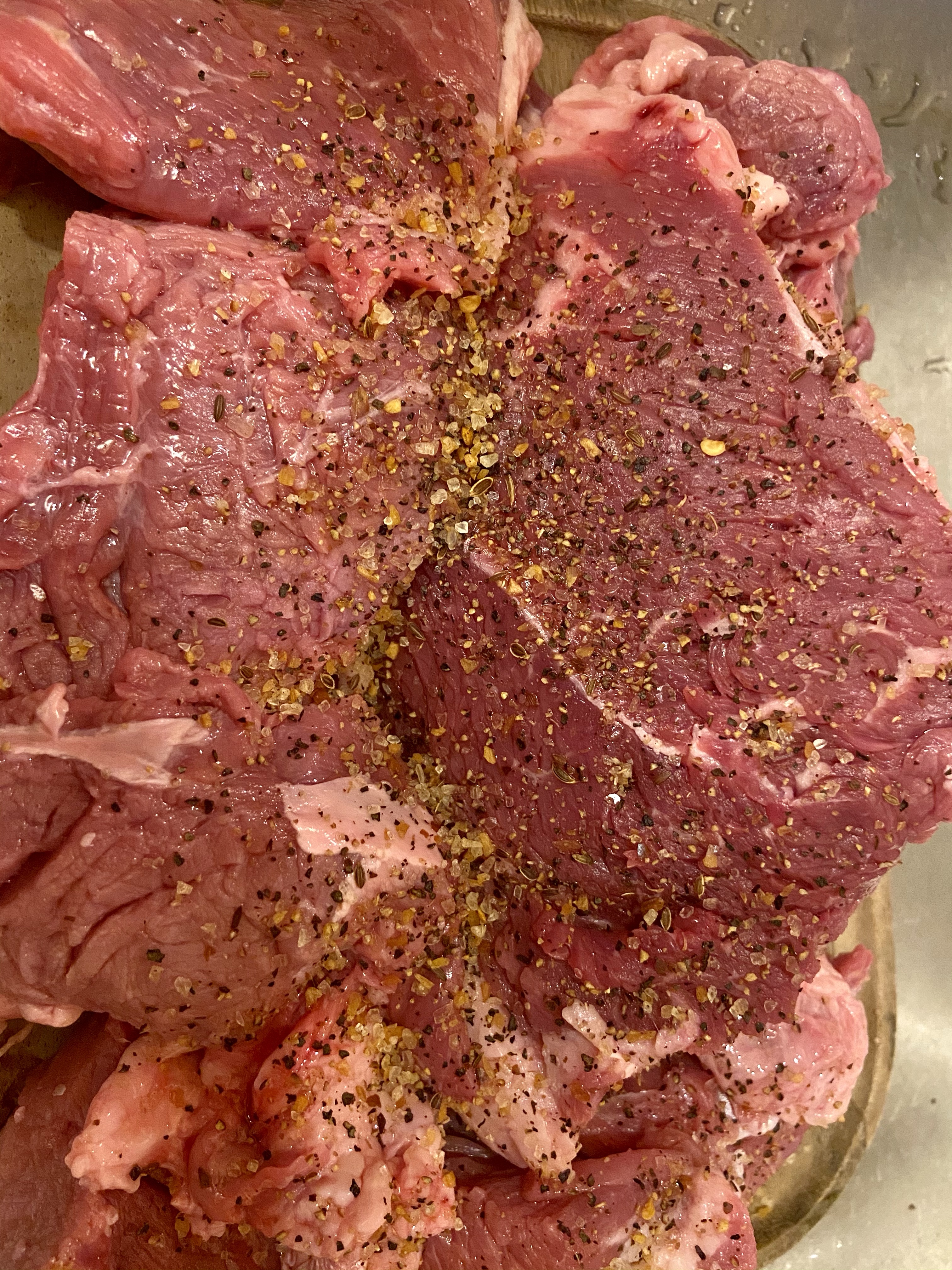 Then add your roast which has been rubbed/coated with seasoning.