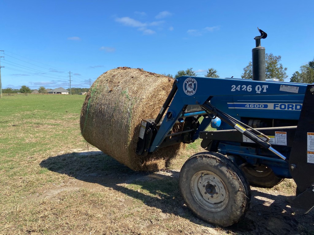Round bales come in different sizes and cost $40 and up depending on size and quality of hay. At our small farm, we feed 3 round bales a week.