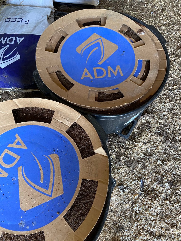 However, most hay does not contain all the nutrients that the cows need. They need minerals. We put out protein tubs with the proper minerals needed.
