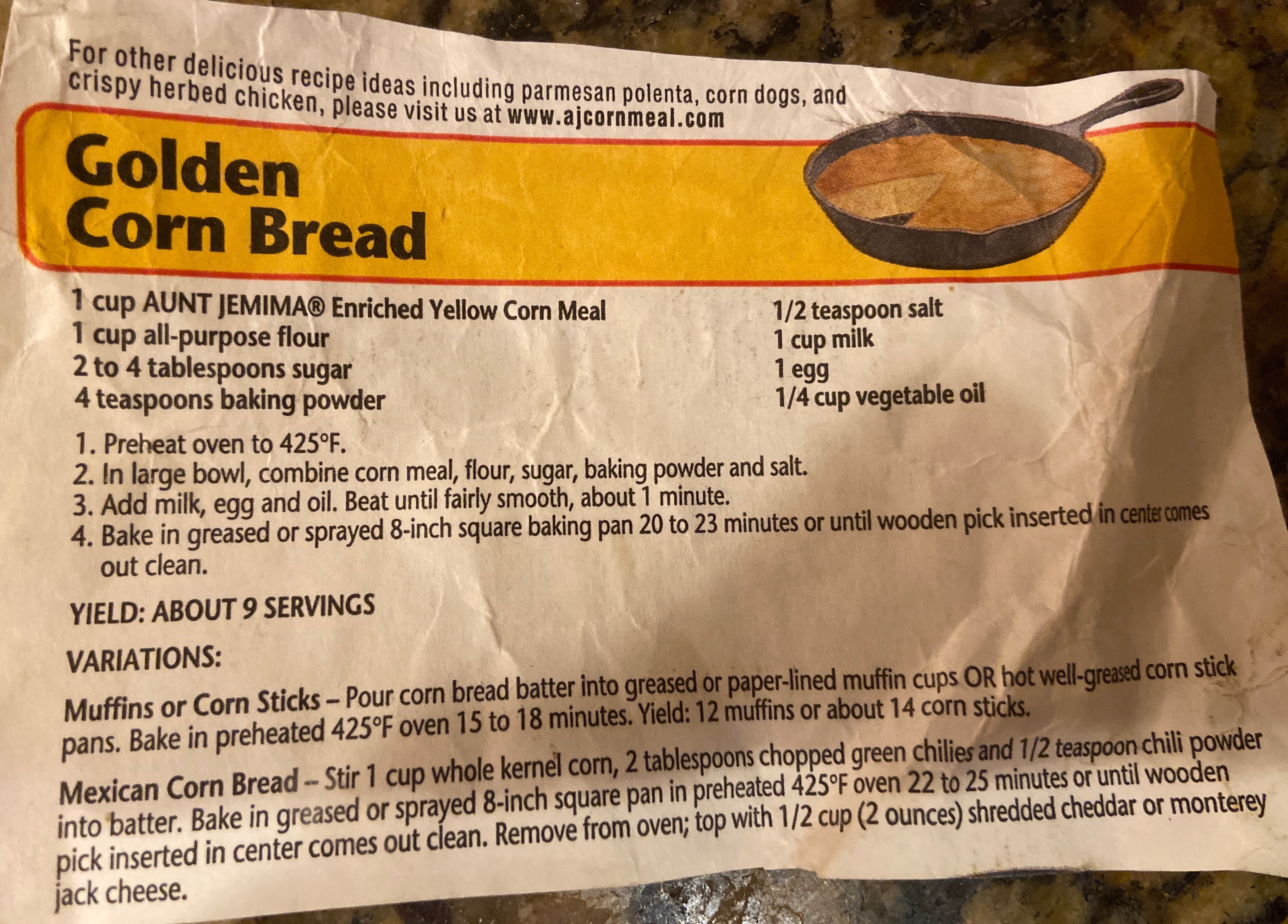 I found this recipe on the back of an Aunt Jemima cornmeal bag one day, and I’ve kept it because it’s so similar to the recipe she taught me (but it has actual measurements).