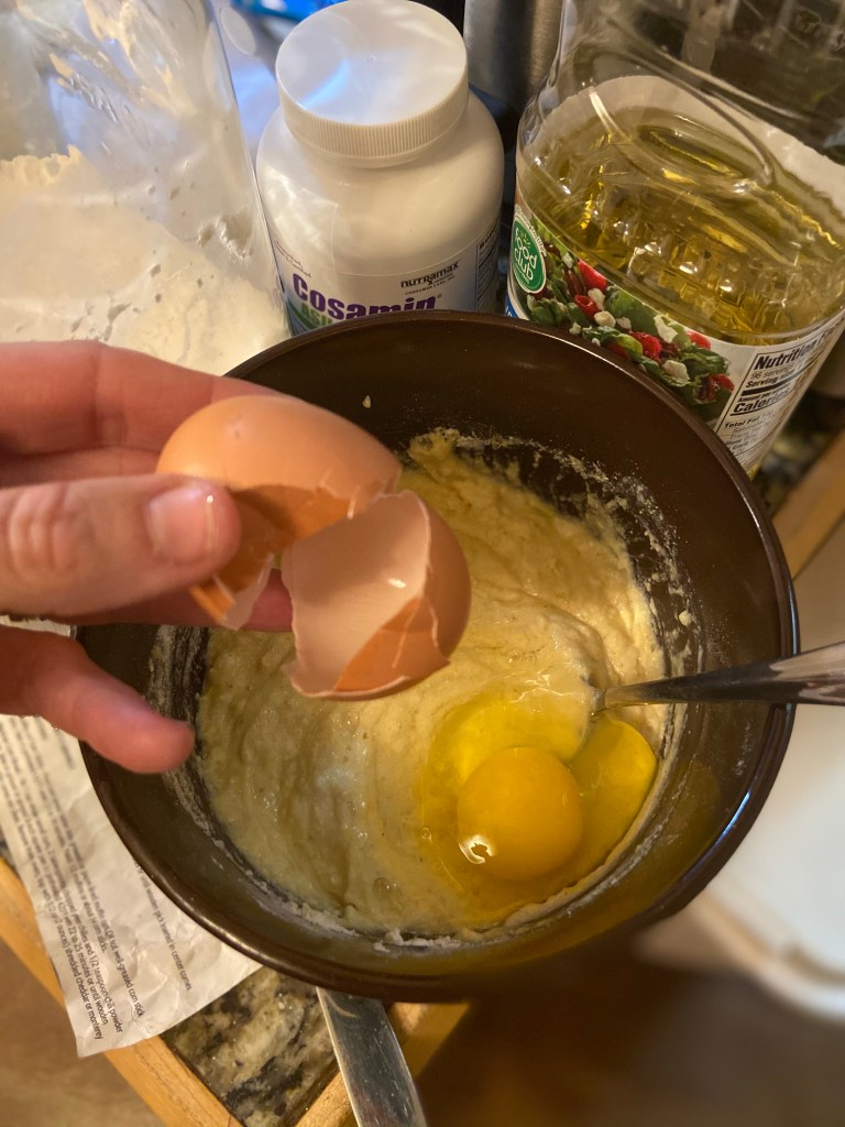 After the dry ingredients are mixed, add the wet ingredients. I add the milk first, stir, then add the oil and egg. Whole milk will make the richest cornbread. We either use fresh milk from one of our cows or this milk from our local dairy.