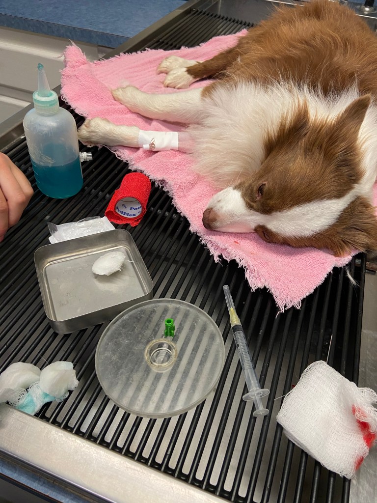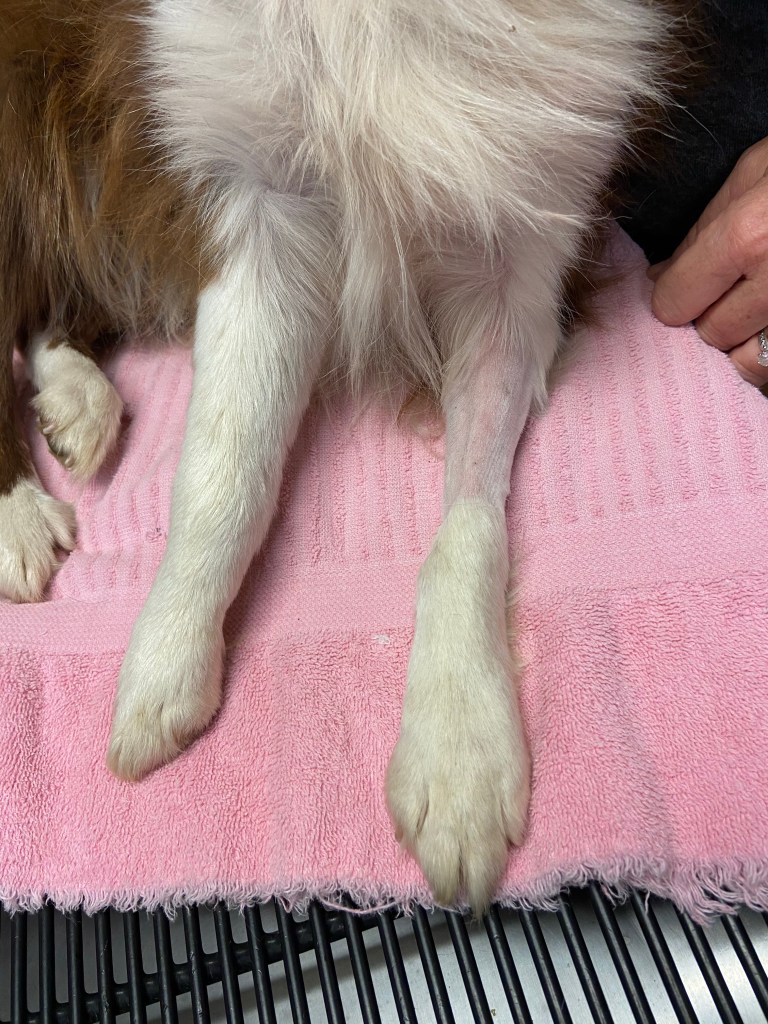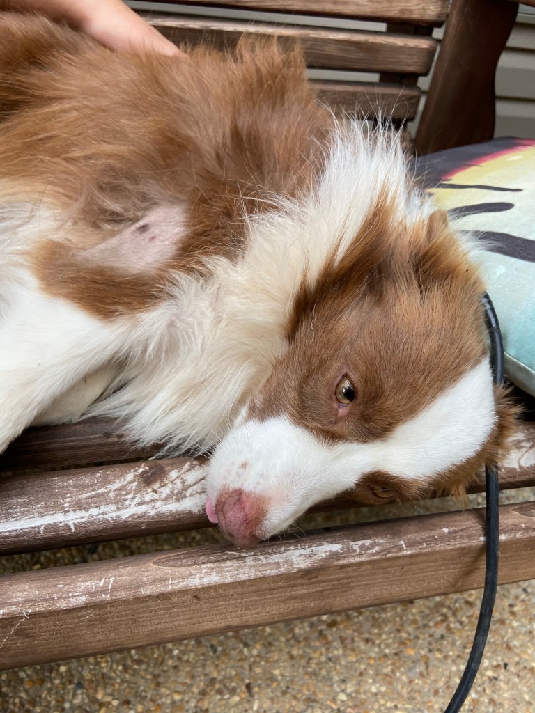Our sweet miniature Australian Shepherd, Ellie Mae Rose, came in at lunch carrying her front right leg. It looked broken.