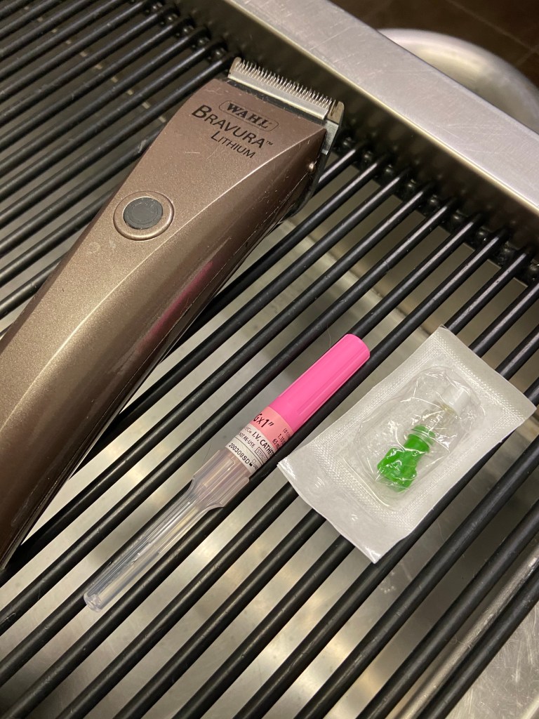 First thing to do is shave her leg to place and IV catheter.