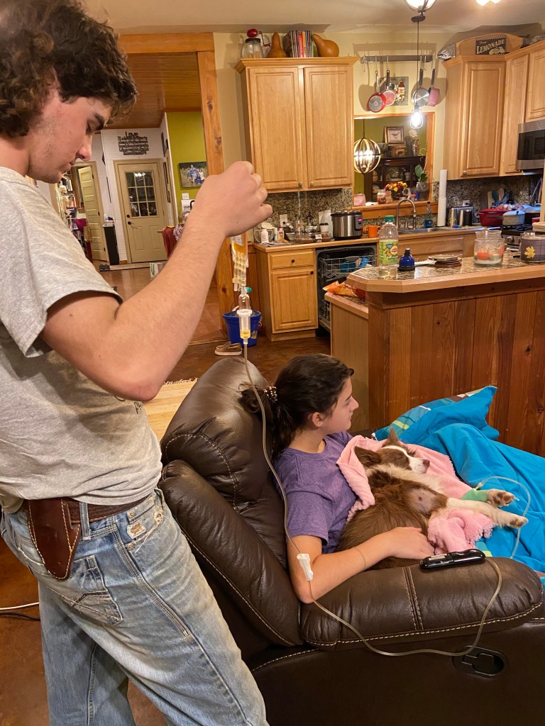 We opted to bring her back home for administration. I can do that because I am a veterinarian and can monitor her for any reactions. I can also maintain her IV line.