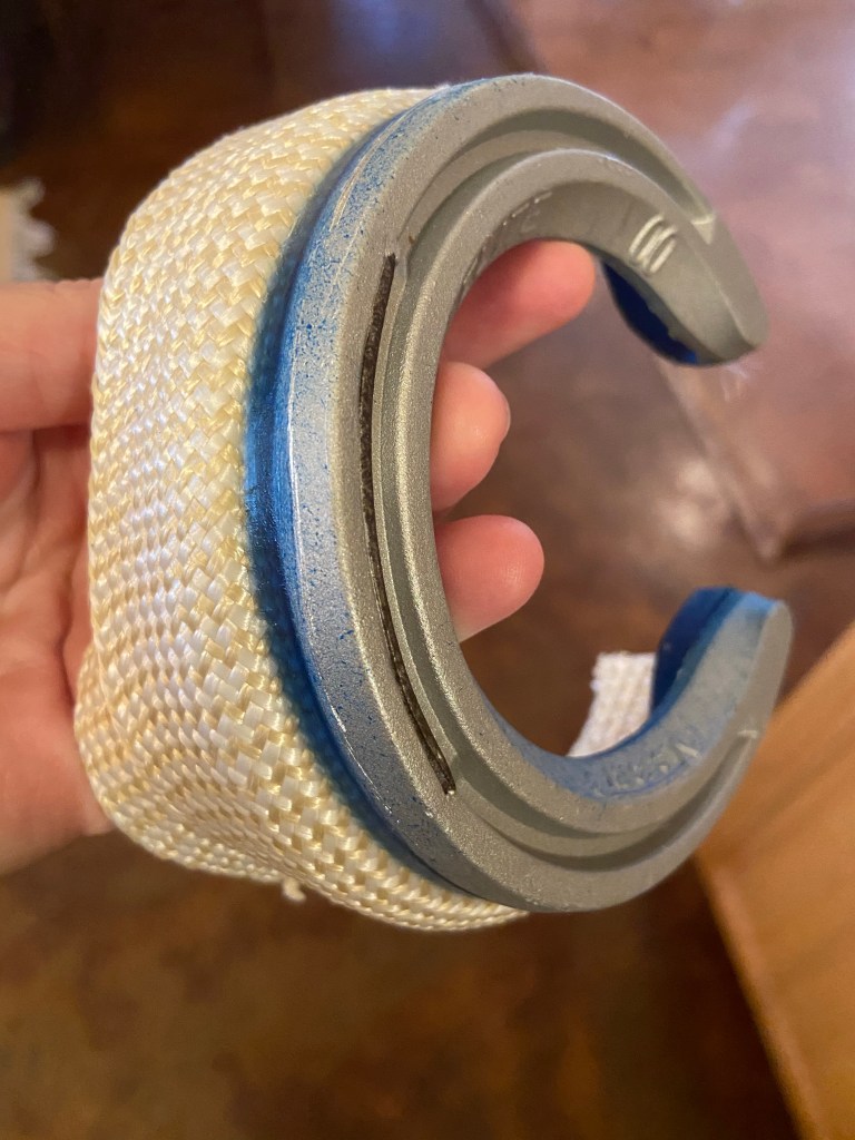 It’s an aluminum shoe that is lightweight and still can be hammered to shape to the foot. There is a fabric webbing adhered to the show that forms a “sock” which holds the adhesive and sticks to the hoof.