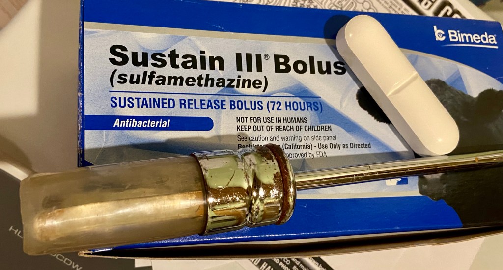 Antibiotics are always debated. It’s best to wait until you see sickness to treat with antibiotics. However, I find these boluses to be a good option. They are one per 200 pounds – so one for each calf. You must have a bolus gun and understand how to administer them. The calf’s head and neck must be stretched out, and the bolus gun must be placed over the “hump” on the back of the tongue.