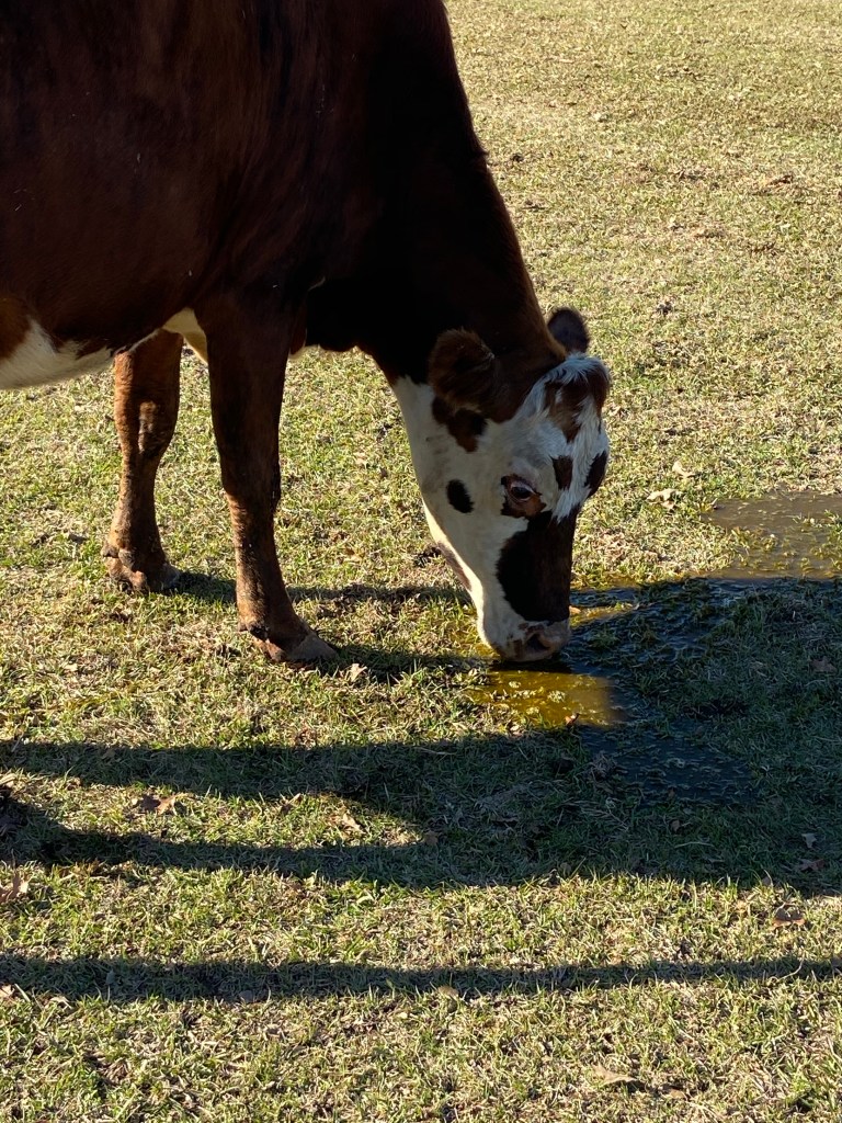 Around 2 pm we noticed her away from the rest of the herd with her tail up and straining. Her “water broke” – which means the placenta tore open and the calf’s feet should be coming.